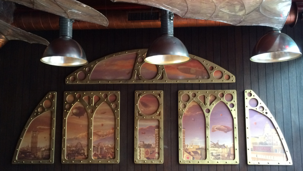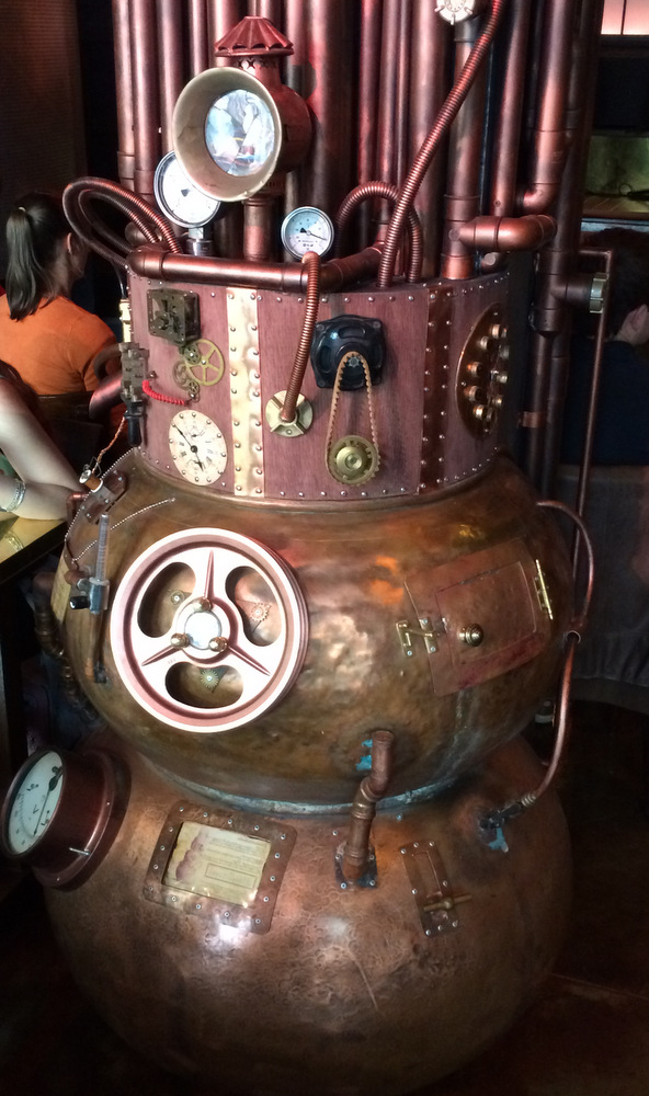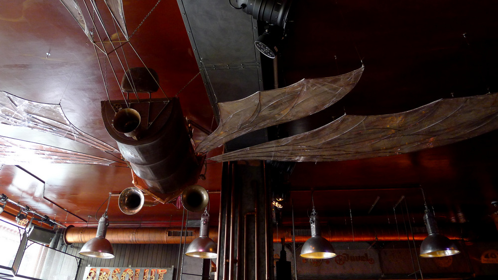 Au rez-de-chaussée, une salle de dimensions moyennes à la déco très agréable, avec des pièces réalisées spécialement pour l’occasion par un artiste local – la créature ailée suspendue au plafond, notamment. Dans le fond, une scène surélevée vouée à accueillir des groupes de musique. Sur le côté, un escalier qui monte vers les réserves et un autre qui descend au sous-sol, tous deux décorés de portraits photographiques ambiance steampunk. En bas, outre les toilettes, des casiers à cadenas pour les gens qui voudraient laisser sac, manteau, voire habits de ville histoire d’enfiler une tenue à la mode vaporiste, mais aussi un fumoir bien aéré et confortablement meublé d’un grand canapé Chesterfield.