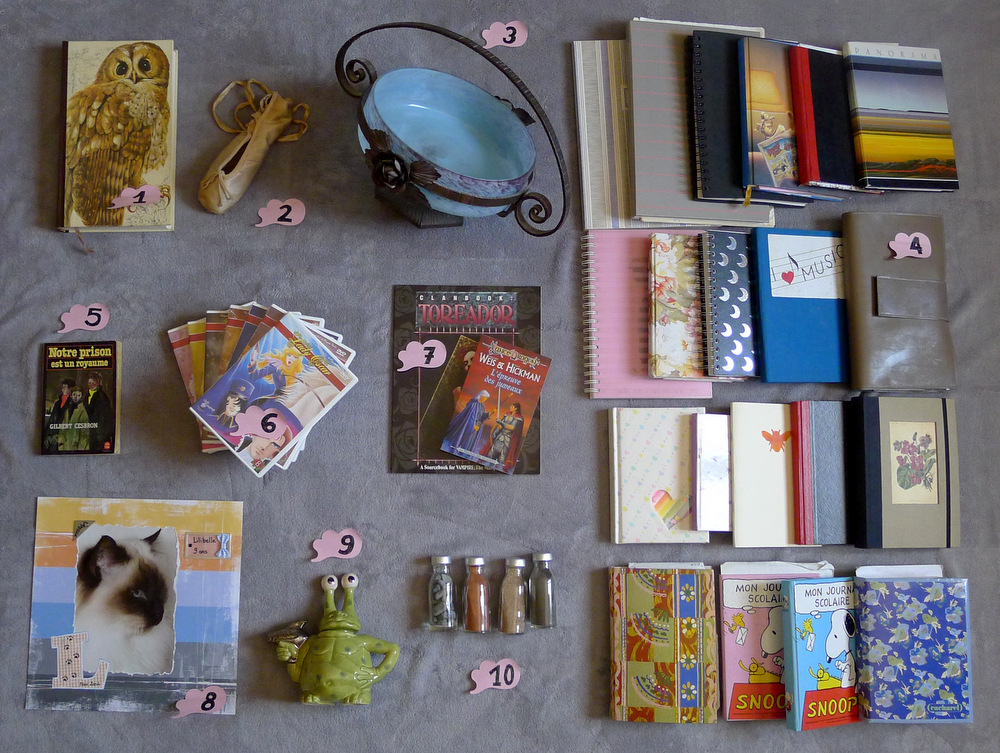 Les ancêtres de ce blog! Je n’ai pas conservé les plus anciens, tenus à partir de l’âge de 8 ans – le premier qui me reste date de 1984. En les ressortant pour les photographier, j’en ai relu quelques passages (ce que je ne fais presque jamais d’habitude), notamment le début de mon histoire avec l’Homme-ce-chacal-jaune. Elle figure dans mes tout derniers carnets écrits, et j’ai été sidérée d’éprouver de telles émotions en la survolant. Le pouvoir des mots…