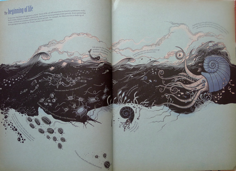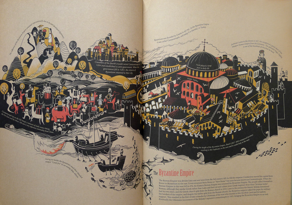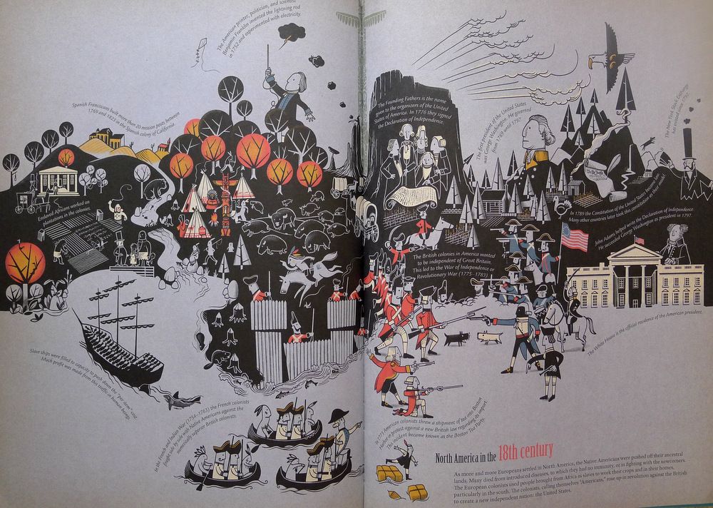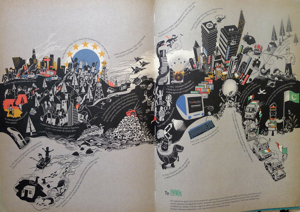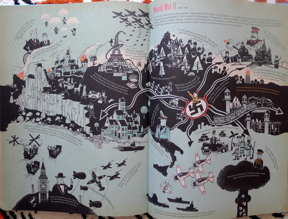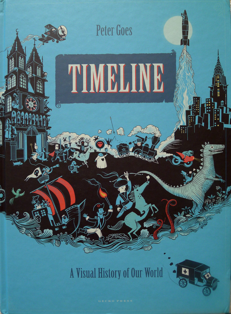 Parmi les ouvrages qui me font systématiquement craquer, il y a les beaux livres dont le graphisme léché sert à représenter le monde sous forme de cartes, de plans ou autre schémas explicatifs. « Chronologie: une histoire du monde » de Peter Goes est le petit dernier de ma collection. Repéré en anglais à la boutique de la National Gallery of Scotland, il doit sortir en français au mois d’octobre et ferait probablement un magnifique cadeau de Noël pour une personne jeune ou moins jeune partageant mes goûts en la matière. Jugez-en vous-mêmes avec ces quelques planches: