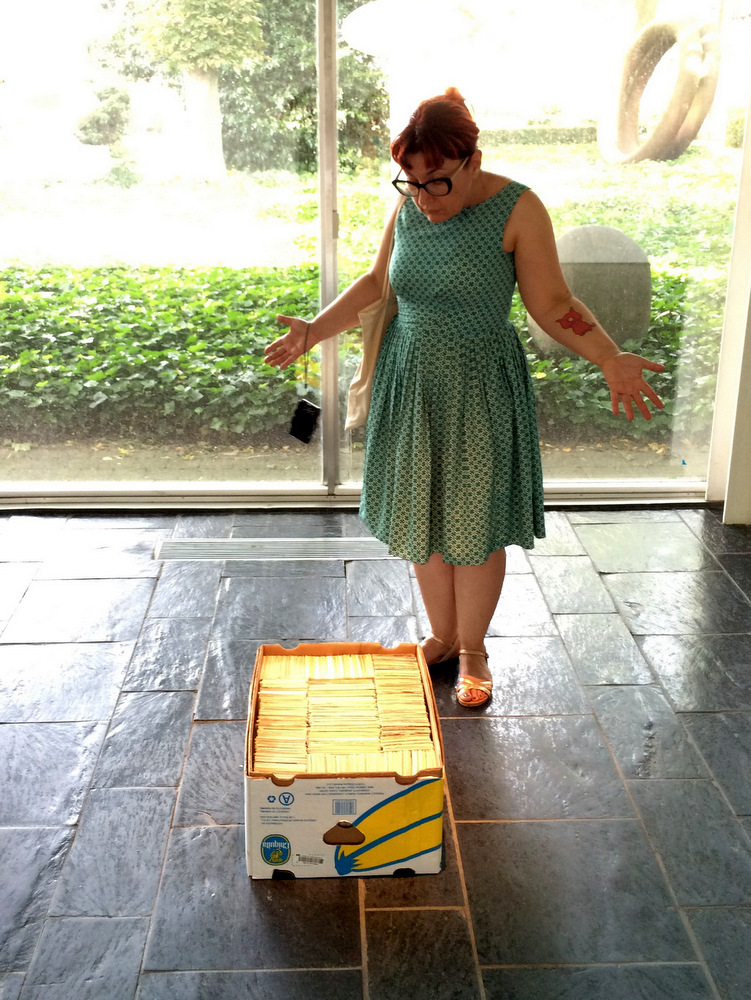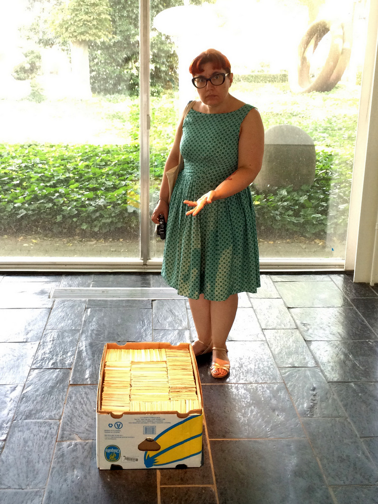 Prenons un exemple récent. Au musée d’Ixelles, où nous nous étions rendus pour admirer la très belle expo consacrée à la peinture hyper-réaliste, on peut voir en ce moment une installation d’Oriol Vilanova, lauréat de l’Art Contest 2015. Dans une vaste salle entièrement vitrée sur un côté, trois cartons de bananes Chiquita régulièrement espacés reposent à même le sol. Ils sont pleins de cartes postales chinées aux puces, rangées de telle sorte qu’on ne voit que leur tranche. Au mur d’en face est suspendu un petit tableau du XIXème siècle, une huile représentant un ciel nuageux. C’est tout.