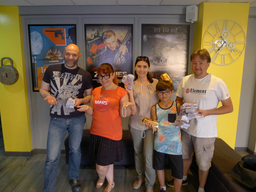 Franchement, on s’est éclatés, et Braqueurs amateurs, dont le thème ne me branchait pas outre mesure a priori, entre illico dans mon tiercé de tête des escape games testés en France (les deux autres places revenant au sous-marin de Hint Hunt et à la Alice au pays des Merveilles de Leavin Room, sur Paris). Nous sommes ressortis à moitié aphones d’avoir hurlé pendant toute la seconde demi-heure, et tous ravis y compris Darklulu qui jouait pour la première fois et qui a apporté quelques contributions essentielles à la progression de l’équipe. Si un jour ma soeur en a marre de la finance, David de la comptabilité, Chouchou de l’informatique et moi de la traduction littéraire, on sait qu’on a de très bonnes bases pour se lancer dans une carrière criminelle! Dans le cas contraire, on pourra toujours se faire un shoot d’adrénaline en retournant jouer chez Enigma Escape: une 5ème salle sur un thème Maya devrait ouvrir d’ici la fin de l’année.