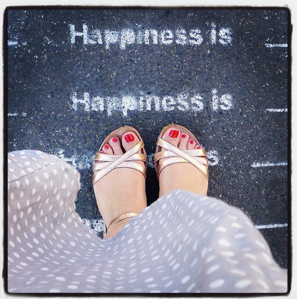 Je me suis secouée pour descendre dans le centre malgré tout. Il faisait bien moins chaud qu’à Toulouse, juste la bonne température pour rendre la promenade agréable, et nous avons décidé de manger dans le coin. En prenant le piétonnier du boulevard Anspach, j’ai remarqué une série d’inscriptions sur le sol: HAPPINESS IS… avec de la place pour compléter. J’ai cherché de la craie en vain avant de prendre le genre de photo dont Scarlett Johansson se serait moquée dans « Lost in translation ». Et je me suis demandé: « Mais au fait, qu’est-ce que j’aurais écrit? En une phrase très courte, c’est quoi pour moi, le bonheur? » Et la réponse s’est imposée immédiatement à moi: le bonheur, c’est être aimé en retour par des gens qui vous le font sentir.