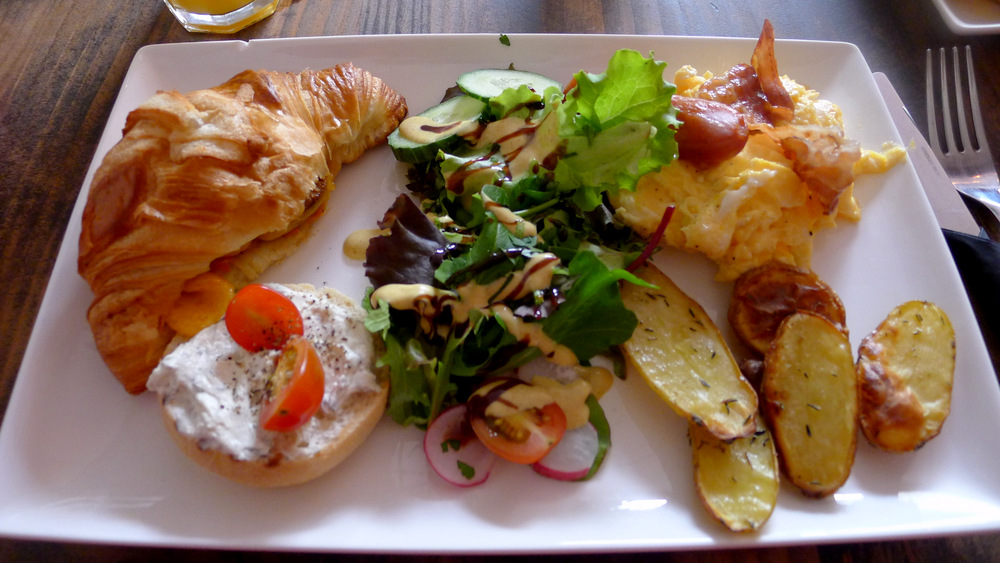 La formule brunch coûte 20€; elle comprend une boisson froide à choisir (orange pressée ou Cava), une assiette salée contenant un croissant garni (option poulet, saumon ou végétarienne), un petit demi-bagel tartiné, une salade fraîcheur, des oeufs-bacon-saucisse et des pommes de terre sautées, et pour le sucré, des pancakes au caramel salé et à la chantilly. Chouchou a adoré; pour ma part, j’ai trouvé le service un poil lent et le contenu de l’assiette salée un rien juste.