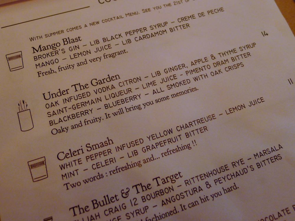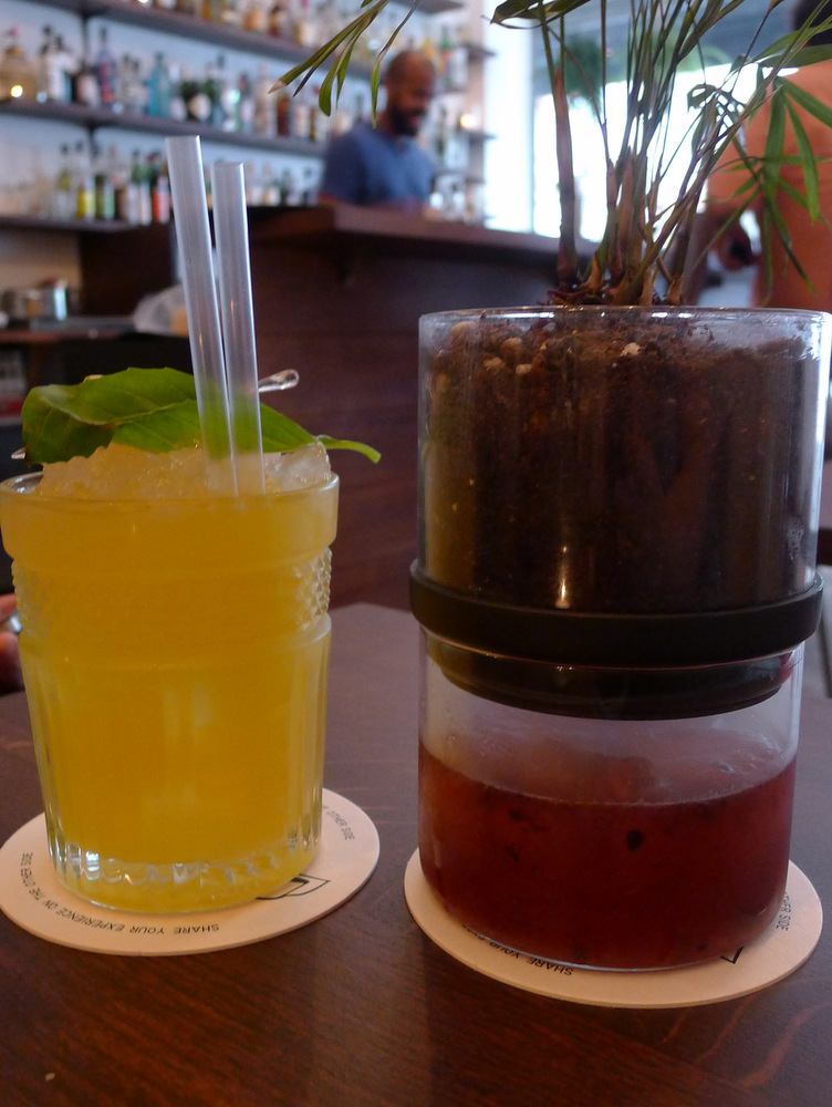 Après avoir hésité ente le Burning passion et le Under the garden, j’ai fini par opter pour ce dernier dont la promesse fumé/fruité m’intriguait énormément. De son côté, Gasparde a pris un Mango blast et, histoire d’éponger l’alcool, un Pistacchio dukkah dip: de petites tranches de pain à tremper d’abord dans de l’huile d’olive, puis dans un mélange d’épices et de graines concassées. Je ne connaissais pas du tout, et j’ai trouvé ça vraiment délicieux. Moins cependant que mon cocktail qui, une fois enlevée la petite plante en pot servant de garniture, tabassait vraiment tout. Au début, il m’a semblé que mon verre avait une très petite contenance, mais vu le dosage d’alcool, j’ai eu bien assez. Et le mélange de goûts, assez étonnant au premier abord, m’a complètement enchantée.