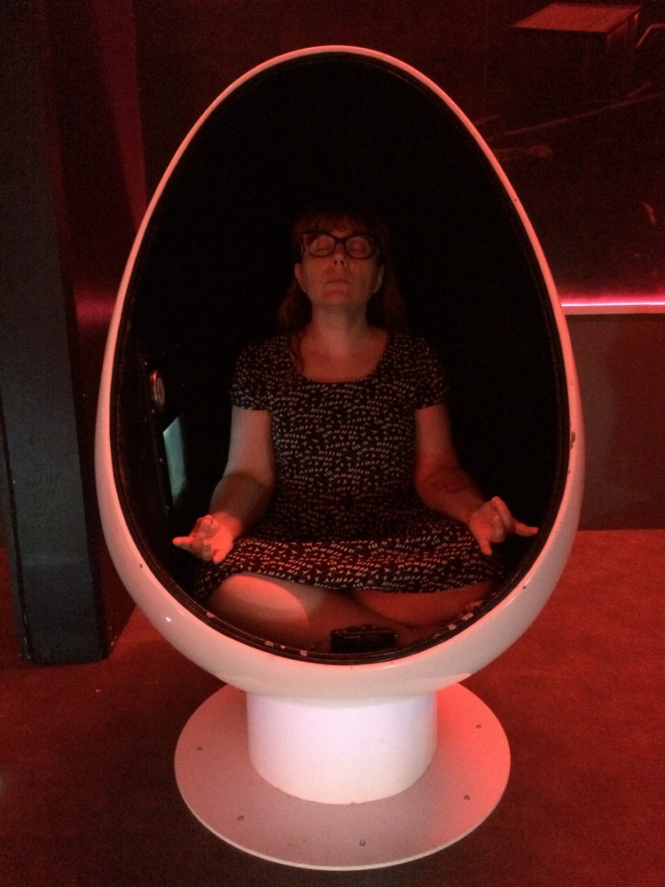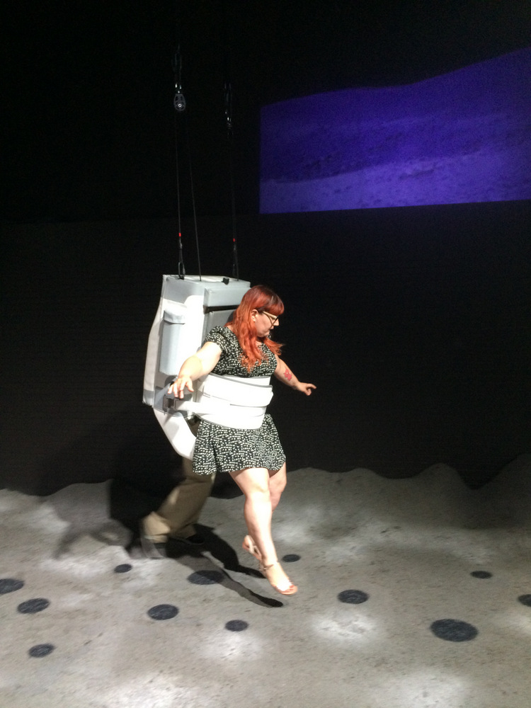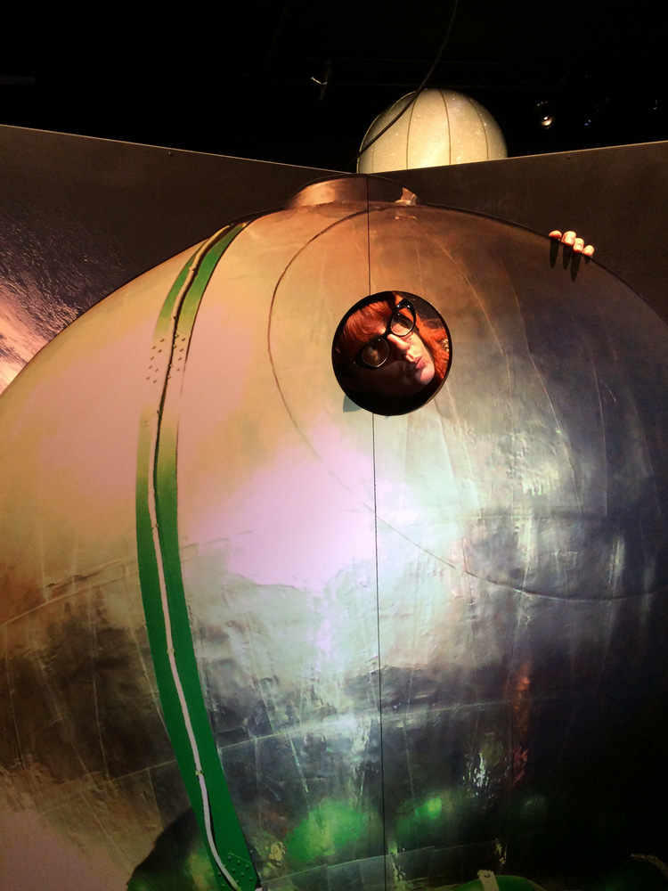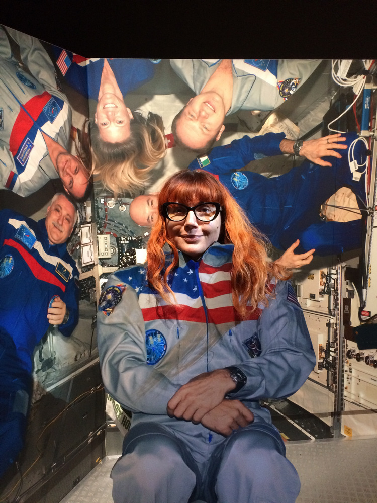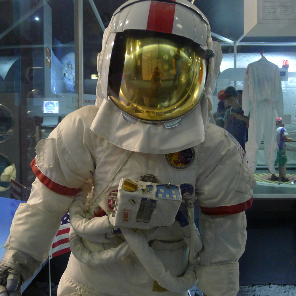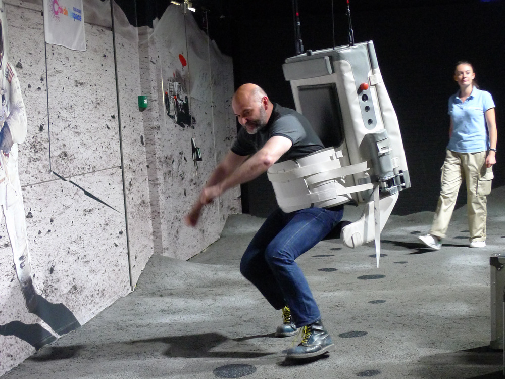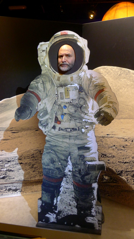 En arrivant aux caisses, je suis assez contrariée de voir le prix de l’entrée: 25,50€ par adulte, quand même… Faut pas être fauché, surtout si on veut venir en famille. Il y a des choses à voir à l’intérieur, sur quatre niveaux, et dans les jardins: comme c’est le début de l’après-midi, on décide de commencer par l’intérieur histoire de rester à l’ombre et plus ou moins au frais. On descend au -1 et on se met tout de suite dans la file d’attente pour le Moon Runner, qui simule la marche des astronautes américains sur la lune. Une heure et demie plus tard (oui, une heure et demie, et je considère comme une grande victoire sur moi-même de ne pas avoir pété les plombs pendant, surtout que je n’avais pas emporté de livre pour m’occuper), notre tour vient enfin. Une décevante minute plus tard, c’est terminé. Les sensations n’ont rien d’extraordinaire et honnêtement, si j’avais su, je ne me serais pas infligé ça. Reste quelques photos marrantes, c’est toujours ça de pris.