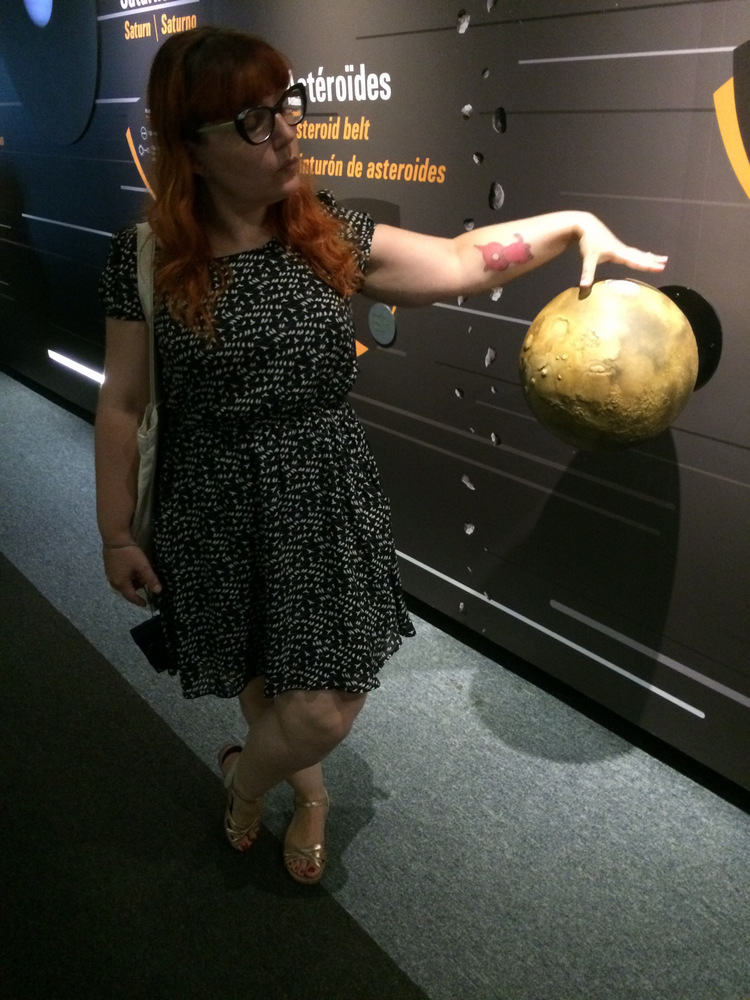 Dehors, le soleil cogne. Nous nous mettons à déambuler parmi les reproductions grandeur nature de la Station Mir, de la capsule Soyouz et de la fusée Ariane 5. Je constate que depuis ma dernière visite, Pluton a disparu de la chouette représentation au sol de notre système solaire. Cette partie du musée me paraît toujours plus attrayante car on y voit concrètement les applications de la recherche – et en observant les conditions de vie des astronautes, on se dit qu’ils doivent vraiment être très motivés pour s’infliger ça! J’aurais beaucoup aimer assister à la nocturne, notamment pour le feu d’artifice, mais nous avons organisé un dîner familial ce soir et nous devons repartir vers 18h. Nous ne nous sommes pas précisément ennuyés, néanmoins si c’était à refaire je ne pense pas que nous reviendrions.
