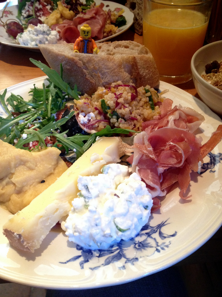 Au buffet sucré, pas de mini-viennoiseries, mais un yaourt nature fabuleux et une compote de pommes délicieuses, du banana bread, des blondies, du muesli, de la pâte de speculoos, de la sauce caramel, de la confiture de rhubarbe. Au buffet salé, pas de plats chauds mais trois belles salades composées, une surprenante tartinade patate douce/lait de coco, du jambon cuit ou cru, un plateau de fromages qui méritent le détour, deux pains tout frais qui craquent sous la dent. Moins pléthorique que d’autres brunchs de notre connaissance, mais tout est d’excellente qualité (bio pour la plupart) et le prix reste abordable: 22€ boissons comprises. Bref, on vous le recommande! Et si vous habitez ou travaillez dans le quartier, vous pourrez y déguster un lunch léger de 12h à 15h en semaine.