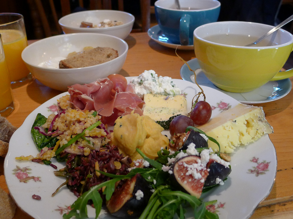 Une façade couverte de lierre, le soleil automnal qui se reflète sur la devanture; à l’intérieur, du bois partout, des fenêtres à croisillons donnant sur un jardin intérieur avec un bassin au milieu, un meuble orné de miroirs taillés en biseau, un vieux poste de radio dans un coin, une grappe de grosses suspensions en papier à l’entrée… Tout de suite, on tombe sous le charme du lieu. Des serveuses ultra souriantes nous apportent une orange pressée, nous demandent ce que nous voulons comme boissons chaudes (pour moi, ce sera un thé vert parfumé irrésistiblement baptisé « Le tango du cactus »), nous indiquent les buffets sucré et salé et nous informent que nous pouvons également réclamer des oeufs brouillés avec ou sans bacon qui seront préparés à la demande.