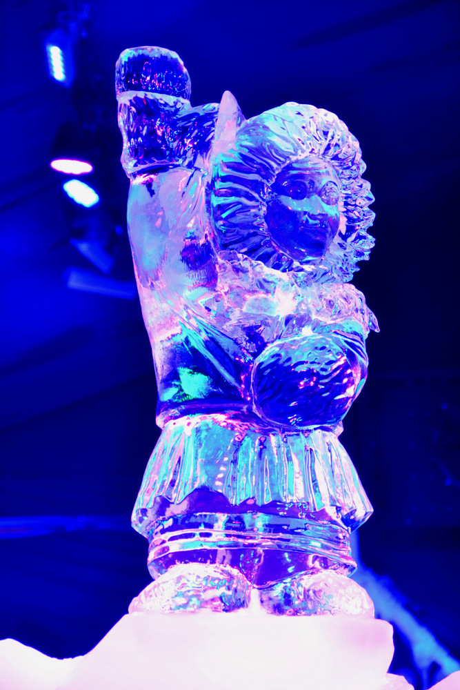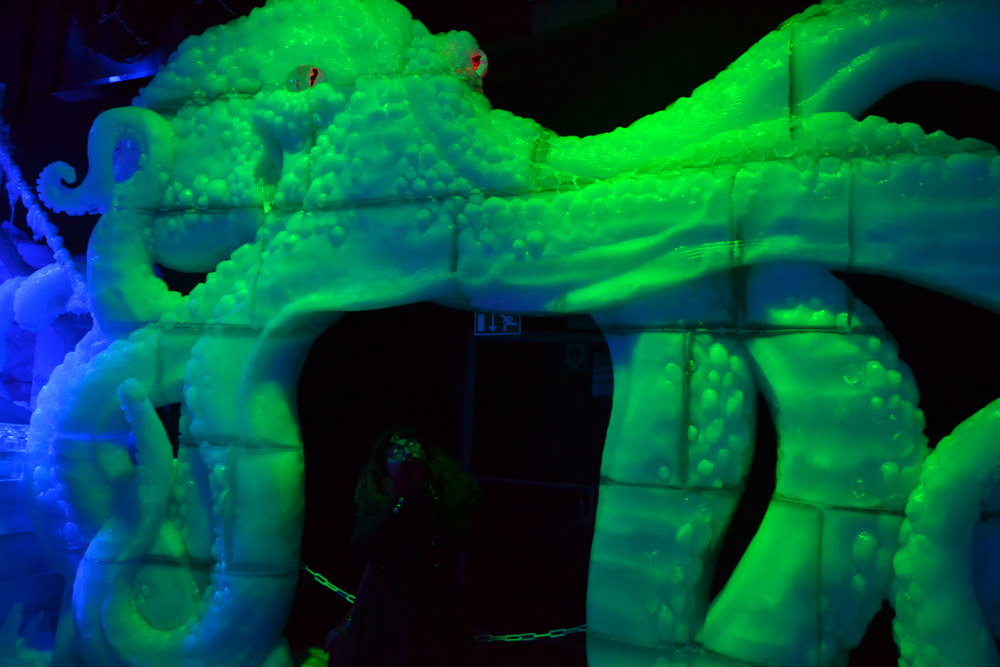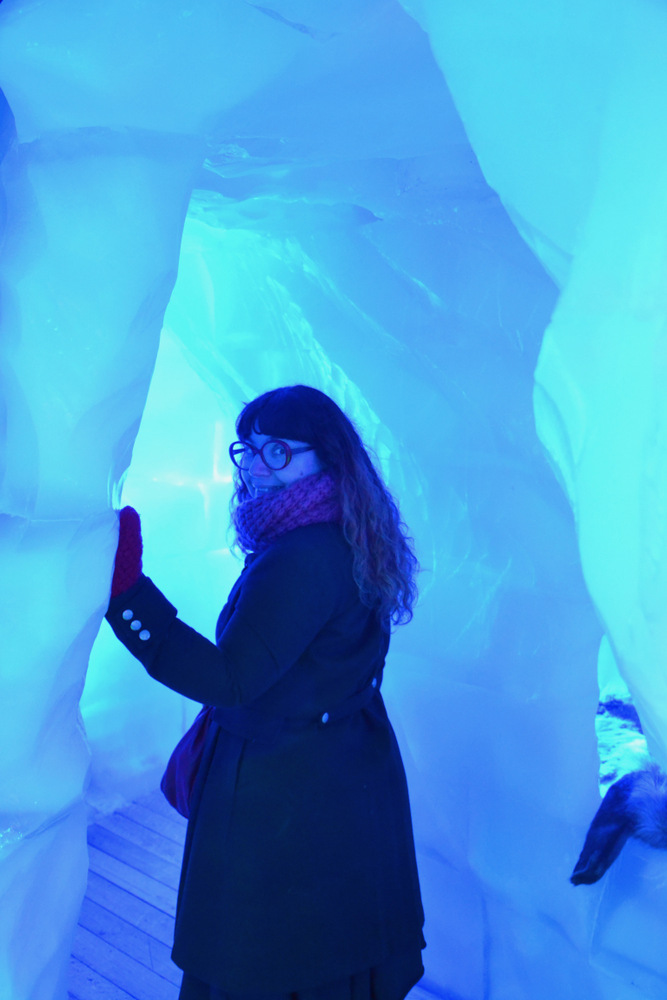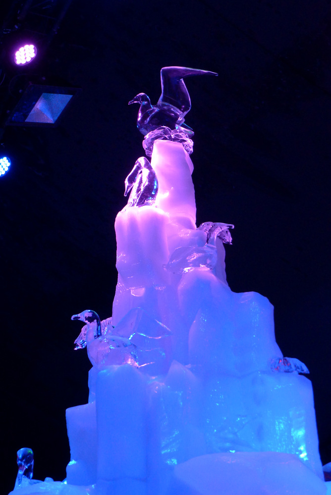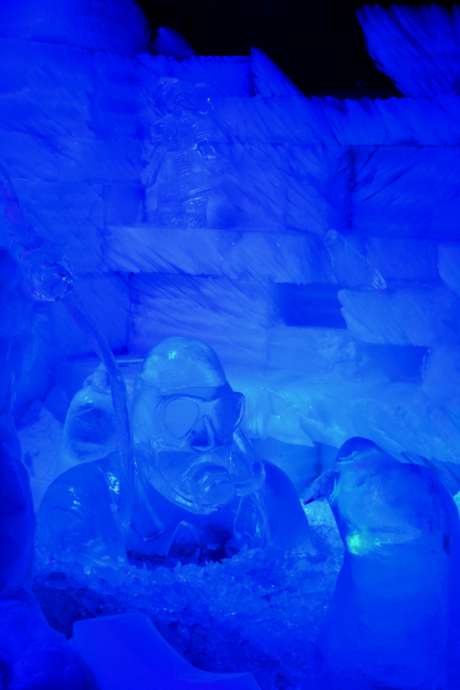 Un peu contrariés, nous avons demandé au GPS de l’iPhone de Chouchou de nous ramener à pied vers le Ice Magic. Et là, horreur malheur: contrairement aux éditions précédentes, qui se tenaient à part du reste des festivités de fin d’année, le Ice Magic Antartica était niché en plein coeur du marché de Noël. Et si mal indiqué que nous avons tourné un long moment pour en trouver l’entrée, au milieu d’une foule compacte et parmi cet infâme mélange d’odeurs de nourriture grasse et de vin épicé que je déteste cordialement. Consolation: les billets coûtaient seulement 9€ (au lieu de 15 d’habitude), et il n’y avait pas de file d’attente pour accéder au chapiteau. Nous avons vite compris pourquoi. La visite est si rapide que pour une fois, nous n’avons même pas eu le temps d’avoir froid aux mains en prenant des photos sans gants. Dix minutes à tout casser.