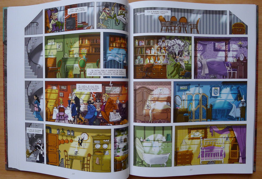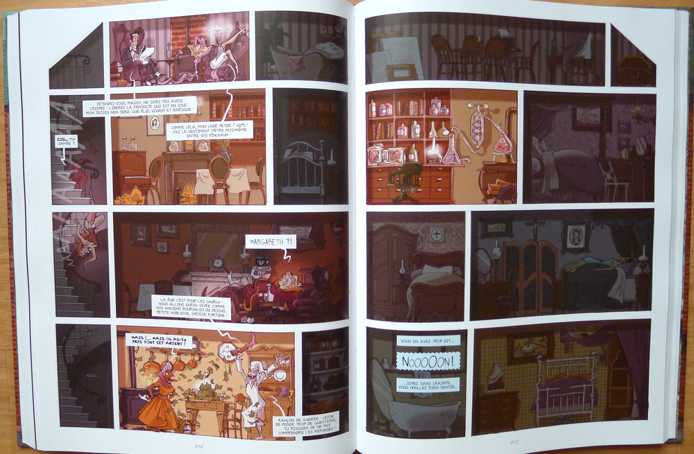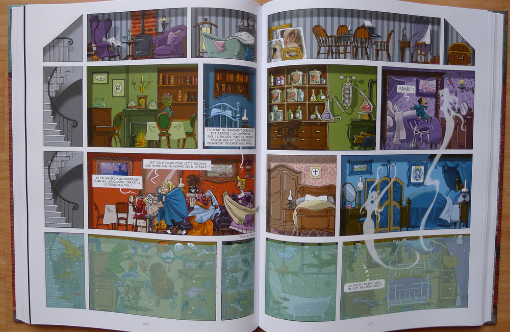 Sorti en 2015 sans grand tapage, « 13 Devil Street: » est réédité en cette fin d’année 2016, ce qui m’a permis de le découvrir un peu par hasard et d’être immédiatement séduite par l’originalité de son concept. En effet, chaque double page montre l’intérieur de la bâtisse en coupe, un peu comme on pourrait regarder simultanément à l’intérieur de toutes les pièces d’une maison de poupée. Plusieurs actions se déroulent en simultané dans une ambiance à la fois policière, vaudevillesque et fantastique; il faut bien observer toutes les cases pour ne manquer aucun détail et comprendre de quelle façon les différentes histoires finissent par se rejoindre. Un bel  et gros ouvrage (plus de 320 pages!) qui devrait ravir même les amateurs de bédé les plus blasés. Je guetterai avec impatience le prochain volume dont l’action se situera en 1940.