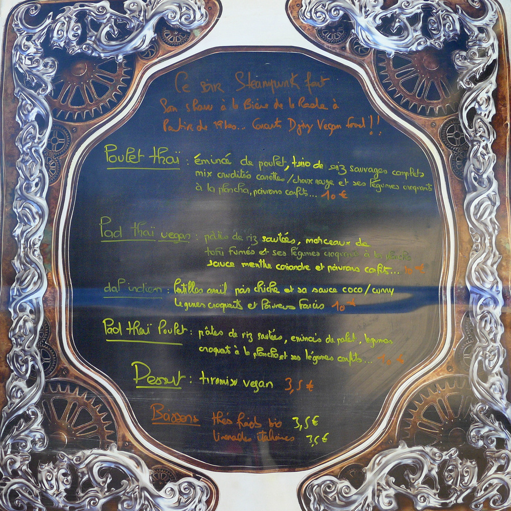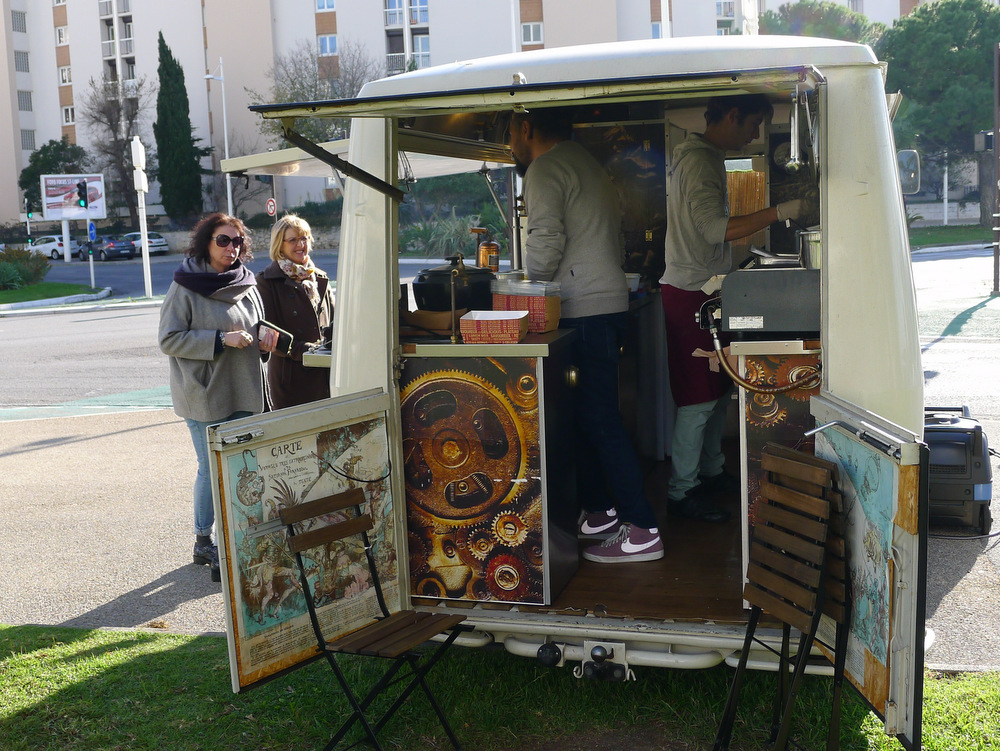 Si la nourriture végétarienne fait peu à peu son apparition dans les restaurants à Toulon, ce n’est que depuis quelques mois qu’il est enfin possible de manger vegan grâce au Steampunk Café. Initiative de Nicolas et Ben, récemment rejoints par Arnaud, ce food truck est généralement installé au rond-point de l’artillerie de marine, entre le port et les plages du Mourillon. On peut manger sur place, sur de petites tables pliantes ou des rabanes installées dans l’herbe de la pelouse voisine, ou acheter un repas à emporter. Chaque jour sont proposés 4 plats, dont au moins 2 vegan et au moins 1 avec viande, plus un dessert, le tout fait maison et à la demande, sans gluten ni lactose mais avec plein de goût!