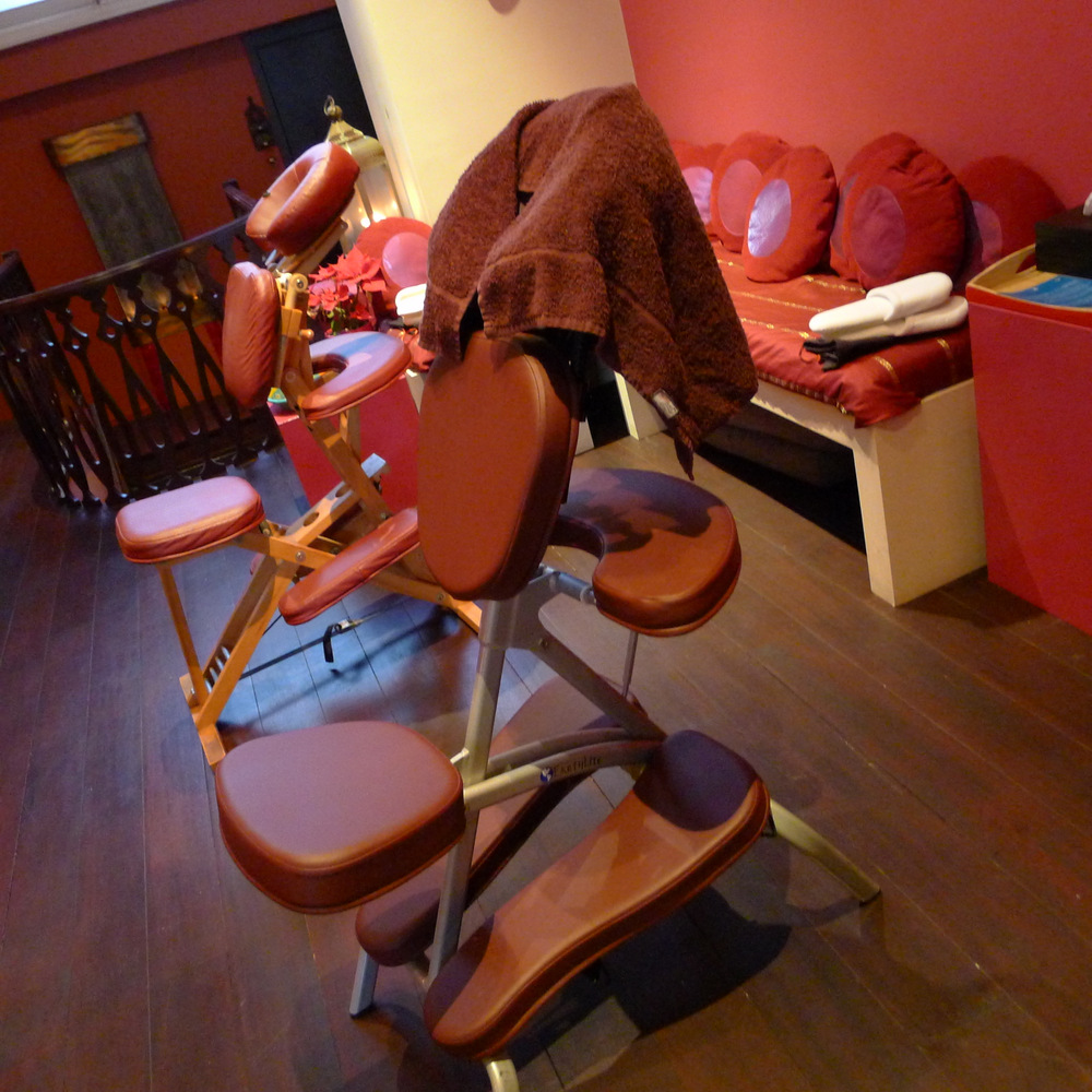 La chaise, on la voit sur la photo ci-dessus. On s’y assoit en position accroupie, avec les genoux et les bras soutenus, le buste légèrement penché en avant et le visage calé dans le trou entouré d’une serviette. Bien que ça semble peu naturel, c’est parfaitement confortable. Et par rapport à un massage en cabine, ça évite de se déshabiller complètement. Ma thérapeute ce jour-là était une jeune femme nommée Mafalda que je voyais pour la première fois. Je lui avais demandé le massage d’une demi-heure (pour les gens vraiment pressés ou désireux de tester le concept à moindre prix, il existe une version d’un quart d’heure). Le haut de mon dos était tellement noué qu’elle a littéralement dû y aller avec les coudes. Ce n’est pas du tout plaisant sur le coup, mais je sais que c’est nécessaire si je veux obtenir le moindre résultat. Des gens moins crispés pourront se contenter d’un traitement plus doux. De toute façon, le/a thérapeute doit constamment vérifier que la pression est acceptable pour le client (ce qu’a fait Mafalda tout au long de la demi-heure que j’ai passée entre ses mains) et la moduler si nécessaire.