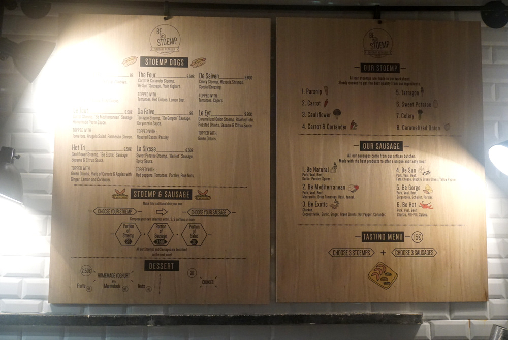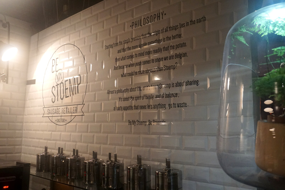 Verdict? Pour moi, l’association du pain et de la purée est un poil trop roborrative, mais les gros appétits y trouveront sûrement leur compte. Surtout, la saucisse comme la purée sont tout à fait excellentes (le pain aussi, d’ailleurs, à la française et bien croustillant). Une prochaine fois, je pense opter plutôt pour la version « normale », servie en boîte déjeuner métallique: on choisit un type de stoemp et un type de saucisse, qui seront accompagnés d’une salade pour seulement 8,50€ l’ensemble. Les gourmands et les curieux pourront préférer l’option dégustation: 3 stoemps et 3 saucisses. Enfin, il est même possible d’acheter juste le stoemp en jolies boîtes de conserve colorées pour le manger chez soi.