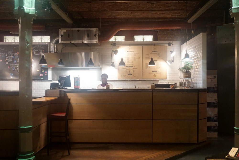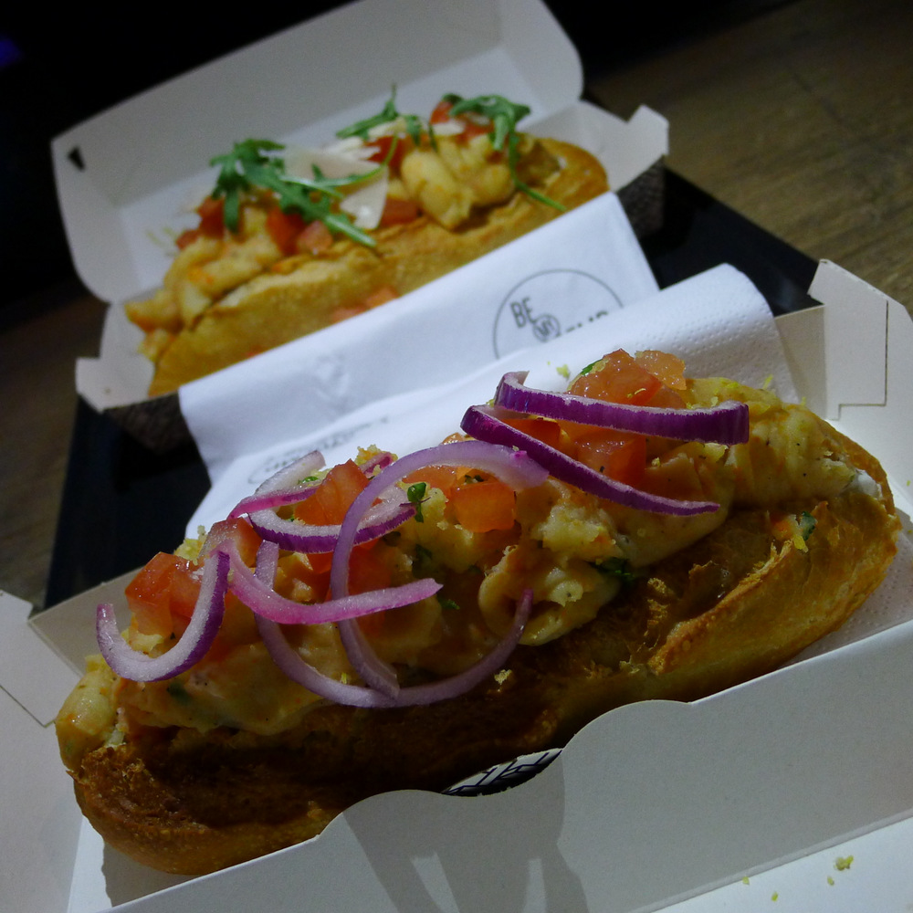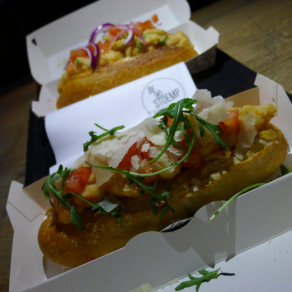 Depuis quelques mois, un comptoir Be my stoemp a ouvert aux Halles Saint-Géry, et en plus de la version classique du stoemp-saucisse, il propose toute une gamme de stoempdogs à consommer sur place ou à emporter. Intriguée par le concept, j’ai accepté une invitation à goûter ça avec Chouchou. Nous avons mis pas mal de temps à nous décider: j’étais tentée par le Eyt végétarien (stoemp d’oignons caramélisés garni au tofu), et Chouchou par le De Salven (stoemp de céleri garni de moules et de crevettes). Histoire de goûter la partie saucisses, nous avons fini par opter pour des recettes un poil plus classiques et comportant néanmoins un petit twist: The Four pour moi (stoemp de carotte/coriandre, saucisse « Be Sun », yaourt nature, tomates, oignons rouges, zeste de citron), et Le Tout pour Chouchou (stoemp de carotte, saucisse « Be Mediterranean », sauce pesto, roquette, parmesan). Be my stoemp ne sert pour l’instant pas de boissons, qui sont à commander au bar voisin avant d’aller s’installer à l’une des tables au centre des halles – mais mon petit doigt me dit qu’ils proposeront une gamme de thés glacés dans quelque temps.