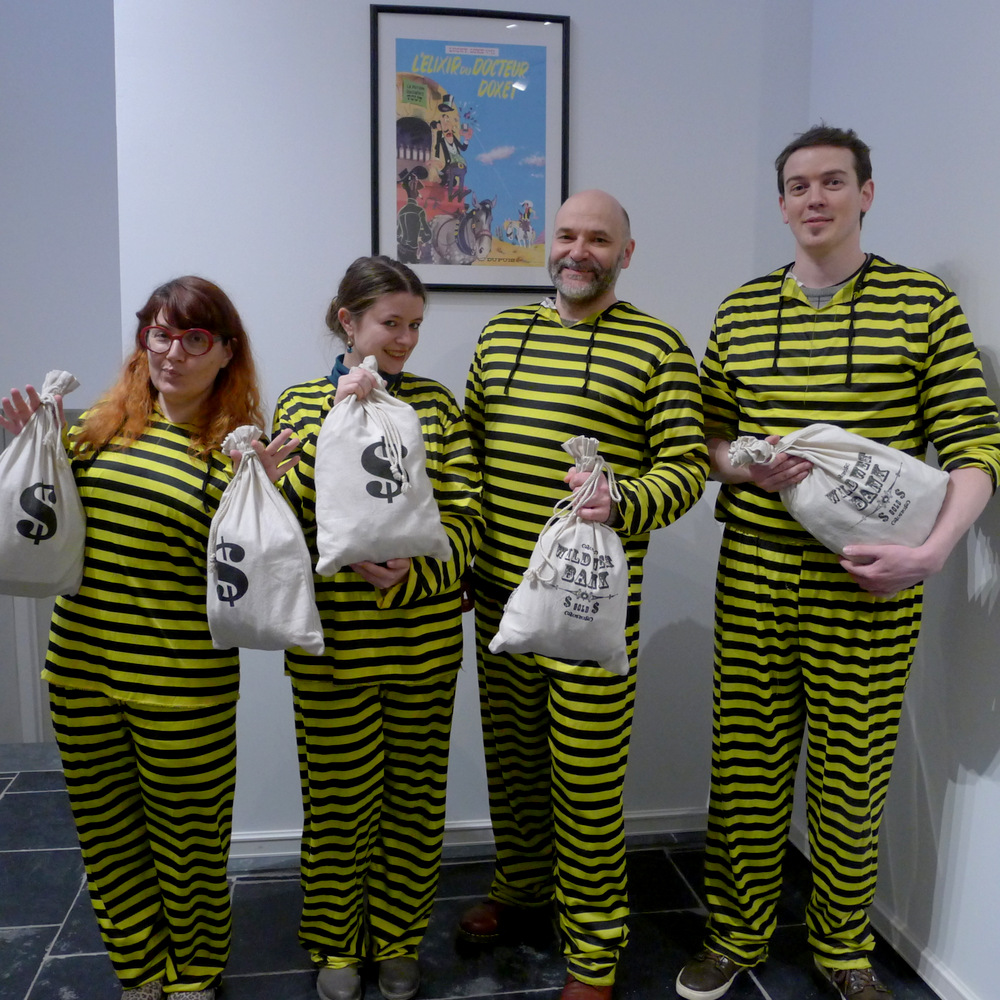 Car la première originalité de « L’évasion des Dalton », c’est que les participants doivent se costumer avant d’être enfermés. Chouette idée: ça permet de se mettre encore plus dans l’ambiance, et ça protège les vêtements civils en cas d’activités salissantes. De plus, les tenues sont bien larges, très confortables et ne grossissent pas trop sur la photo. (On a les priorités qu’on peut.) Une fois changés en frères Dalton, nous avons eu droit à un briefing fait par notre Game Master Guylaine. Après un énième braquage de banque, nous nous sommes faits cueillir par Lucky Luke, et nous attendons dans une cellule de la prison locale qu’un fourgon vienne nous emmener au pénitencier. Si nous voulons nous échapper, c’est maintenant ou jamais…