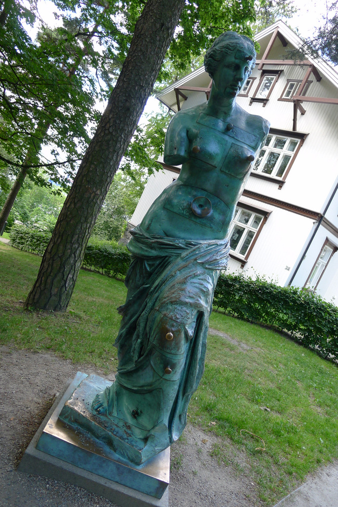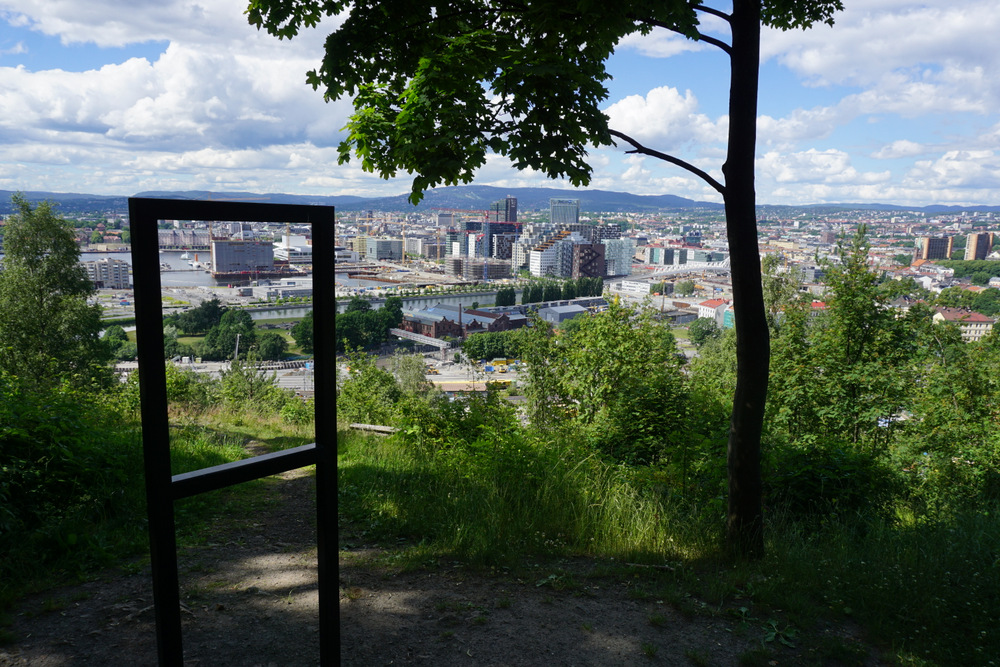 Nettement plus de monde au parc Ekeberg où on peut également admirer des sculptures (dont la rigolote Vénus à tiroirs-qui-s’ouvrent-pour-de-vrai de Dali et un tas d’autres sujets à poil). / Sauf que ce n’est pas un parc mais une forêt qui monte et descend dans tous les sens, avec un plan vraiment pas très clair, et qu’on va finir par se paumer en cherchant l’installation de Marina Abramovic. / Qui se révèle être un simple cadre évidé devant lequel l’artiste suggère de se placer en fermant les yeux pour pousser un grand cri face au panorama. / Non parce qu’apparemment, c’est ici qu’Edvard Munch a vécu le moment qui lui a inspiré son célèbre tableau. / J’avoue, je me sens flouée. / Au moins, il y a une belle statue de Botero à la sortie.