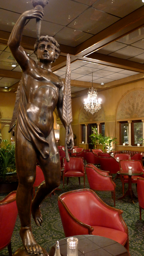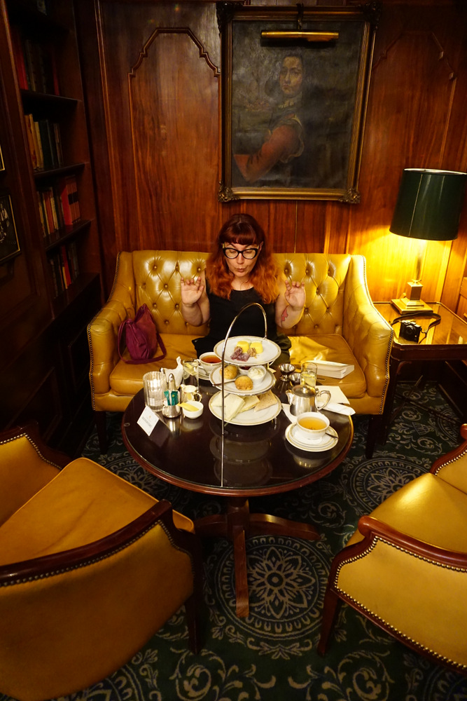 Puisque l’art a décidé de nous frustrer aujourd’hui, rabattons-nous sur une valeur sûre: l’alliance du thé et de la bouffe, alias un afternoon tea. / La salle Bibliotekbaren de l’hôtel Bristol est superbe, à la fois luxueuse et cozy, surtout qu’on nous attribue un des jolis box garni d’un canapé Chesterfield. / Par contre, l’afternoon tea est de loin le plus maigre qu’on nous ait jamais servi: trois triangles de pain de mie, quatre bouchées sucrées, un bébé scone (je ne savais même pas qu’on pouvait les faire aussi petits) et un thé pour plus de 32€ par personne, y’a vraiment de l’abus. / Néanmoins, nous passons deux heures délicieuses à lire au calme et avoir une discussion qui pourrait bien présager de grandes choses pour l’avenir; donc, on va dire que c’était quand même un investissement judicieux.