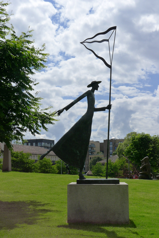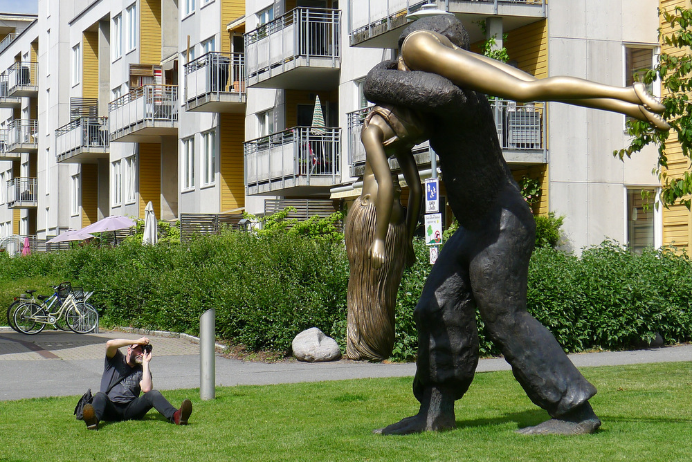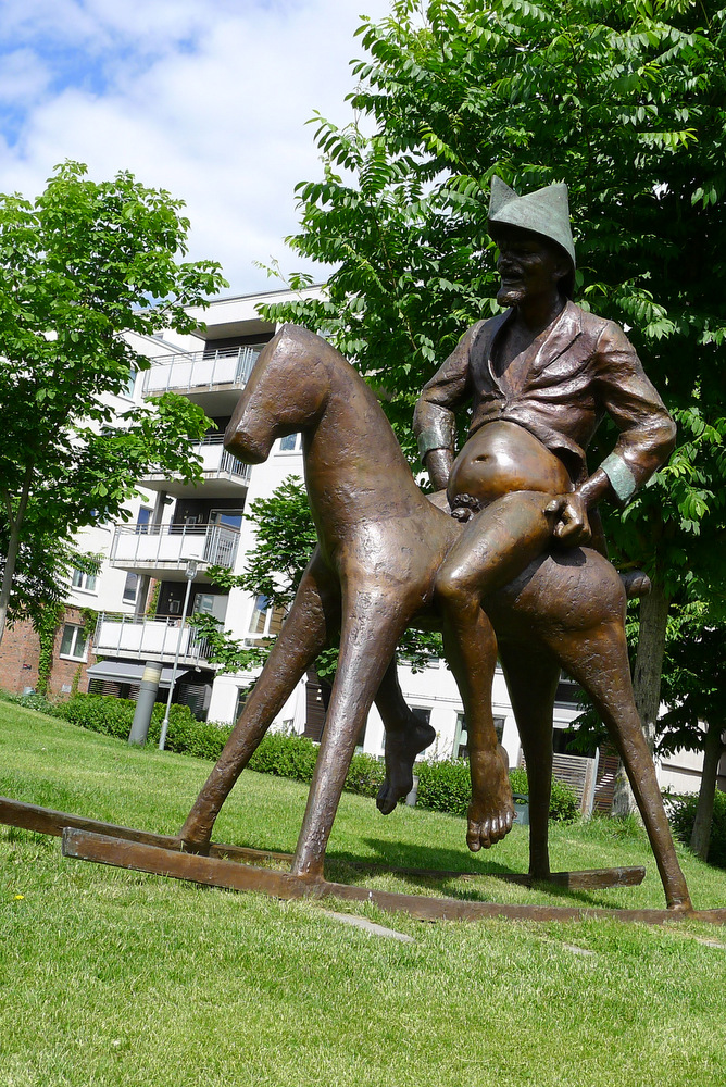 Je tiens une grosse flemme ce matin, et si on glandait à l’appart’ jusqu’à l’heure du déjeuner? / Les pâtes saumon-asperges d’hier soir sont nettement meilleures réchauffées. / A mon avis, nous sommes les premiers et les derniers touristes qui prennent la peine de se traîner jusqu’au parc de sculptures Peer Gynt. / …Peer Gynt qui, contrairement à ce que j’ai toujours cru, n’est donc pas la VO de « Pierre et le loup » – ou alors, il faut qu’on m’explique ce que ce gorille fout là. / Et le type assis la bite à l’air sur un cheval à bascule, aussi. / N’empêche que même les ensembles HLM d’Oslo sont nickel, avec plein d’espaces verts bien entretenus et d’aires de jeux super fun.