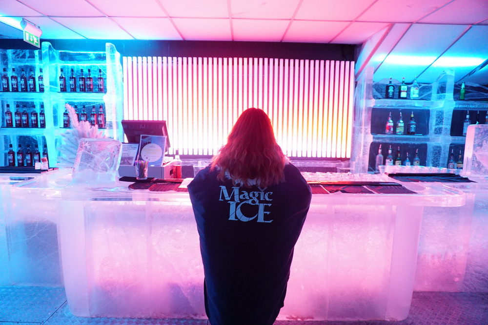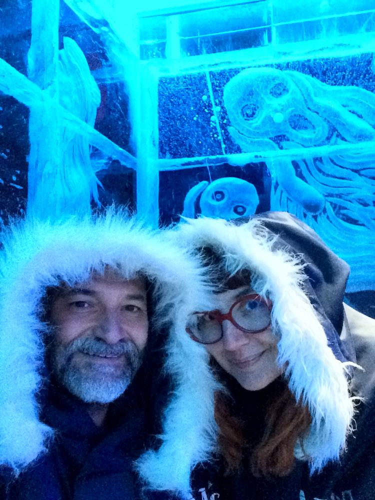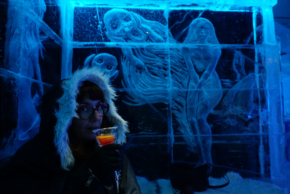 Un coup d’oeil au grand magasin Steen & Strom, le Printemps Haussman local, juste histoire de. / Le maquillage, je m’en fous, les fringues, y’a que des marques étrangères (françaises pour beaucoup), et la déco, y’en a pas. / Mais Chouchou passe quand même un moment au rayon Lego de l’étage des jouets, pour la forme. / « Regarde, me dit-il. Maintenant, il y a des personnages féminins dans les boîtes. » Dénombrement rapide. « Ouais, une sur cinq. Je rappelle que nous composons toujours la moitié de l’humanité et pas 20%, merci, bisous. » / Ces carrés de pizzas achetés au food court pour combler notre petit creux de 16h sont juste fabuleux. / En plus, ça m’évitera d’être soûle tout de suite au Magic Ice Bar. / …Lequel vient juste de se vider suite au départ des passagers d’un bateau touristique, de sorte que nous sommes seuls dans la salle, sans même la barmaid qui tarde à se manifester. / Clairement, il faut venir pour l’originalité de l’endroit et pas pour la déliciosité des cocktails super basiques. / « J’ai eu la main lourde sur l’aquavit, me prévient la barmaid, vous voulez que je le recommence? » « Non non c’est bon ça ira. » / En fait, l’aquavit, c’est la vodka scandinave: c’est transparent, ça ne goûte rien donc on ne se méfie pas, et paf!