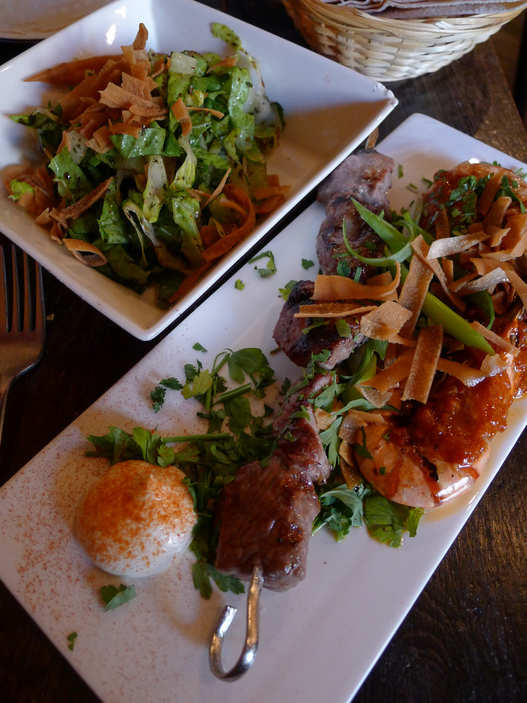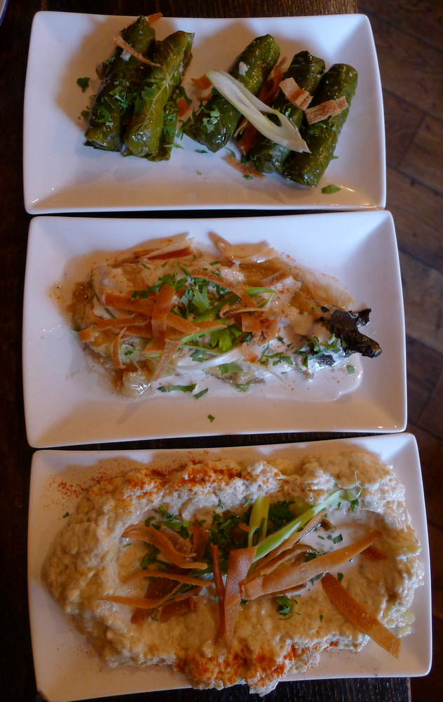 Servis assez rapidement (il n’était que 19h et la salle était encore presque vide), nous nous sommes partagé des feuilles de vigne, une aubergine fumée en sauce et surtout un moutabale peu photogénique mais sublime à s’en lécher les doigts.