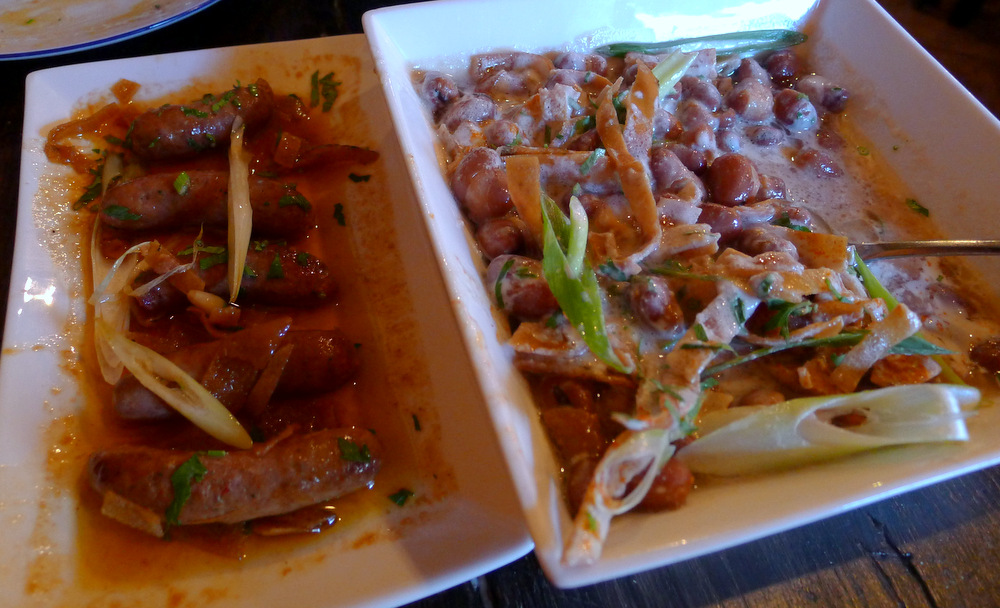 Après ça, des petites saucisses boeuf-agneau piquantes (il en manque deux dans le plat, déjà englouties avant que je pense à faire une photo) et une portion généreuse de foul mdamas: des fèves à la crème de sésame et au citron, une véritable tuerie engloutie sans le moindre remords vu que, hé, les légumes secs, c’est excellent pour la santé!