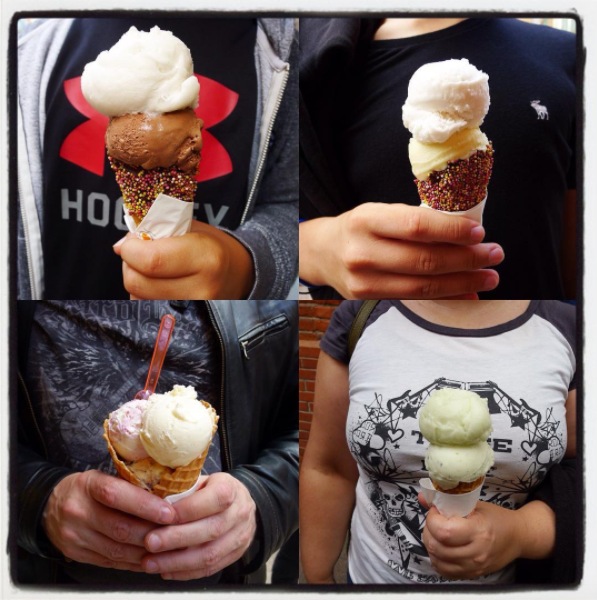 J’aurais bien mangé une glace chez Octave, mais 1/ ils ont arrêté mon parfum préféré 2/après nous avoir donné les cartes, le serveur nous ignore royalement. Direction: O sorbet d’amour, où il y a plus de choix et où les boules sont plus grosses et moins chères. Parmi les nouveautés, pomme verte et chocolat-piment d’Espelette me font de l’oeil.