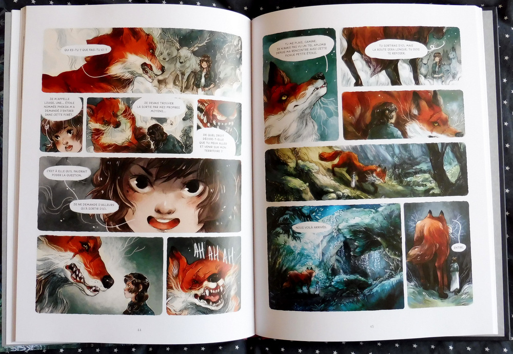Si le personnage de Phekda peut donner l’impression que « La Grande Ourse » s’adresse à un jeune public, le thème abordé en fait plutôt une bédé pour adultes, mais pour adultes ayant gardé de leur enfance une forte sensibilité au merveilleux. Les très beaux dessins à dominante bleue de Sanoë illustrent parfaitement l’atmosphère magique de l’histoire d’Elsa Bordier, en équilibre délicat entre nostalgie et surnaturel. Mention spéciale au poulpe et au renard, que j’aurais bien aimé rencontrer moi aussi!