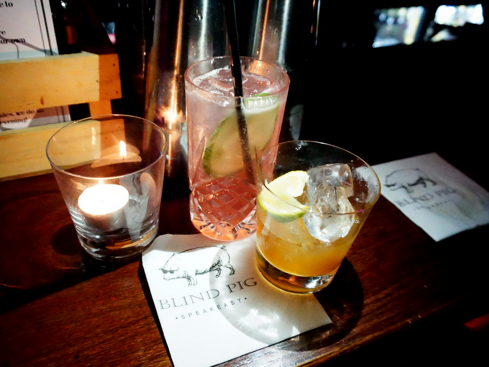 On accède au bar par une authentique porte dérobée qui m’a fait couiner de ravissement. La salle en sous-sol, aux murs de pierre nue, est basse de plafond et toute en longueur. Les tables sont réservées aux gens qui dînent là; les clients uniquement venus boire un verre doivent s’asseoir au bar. D’habitude, je déteste ça; là, j’en ai profité pour faire parler un peu le barman. Dans la droite lignée des speakeasy d’autrefois dont The Blind Pig porte le surnom, la carte ne propose que des cocktails à base de whisky ou de gin, qui ne sont vraiment pas mes alcools forts préférés, et déconseille aimablement de réclamer des mojitos à la fraise ou autres boissons de fillette. Hum. OK.