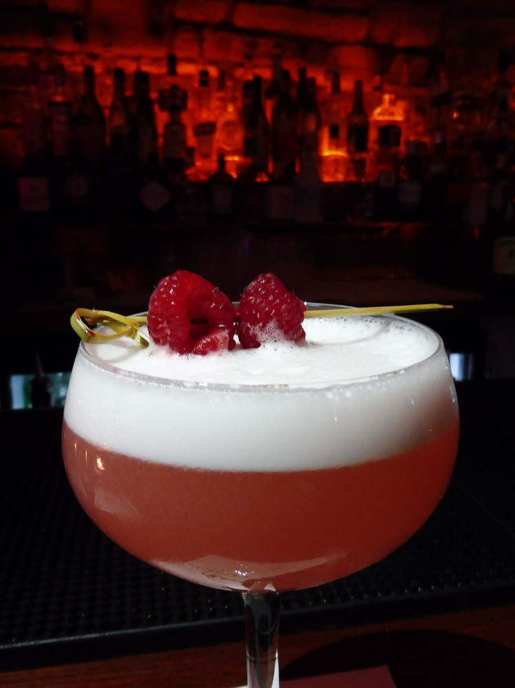 Du coup, après ça, j’étais prête à me montrer un peu plus aventureuse et à piocher dans la carte malgré mes a priori. J’ai opté pour le Clover Club: gin Mor, Noilly Prat (du vermouth), sirop de framboise maison, jus de citron et blanc d’oeuf. (Justement, le blanc d’oeuf fait partie des ingrédients qui me répugnaient à première vue, à cause de son horrible texture, mais dans les cocktails, il intervient battu en mousse sur le dessus et passe très bien.) C’était tout à fait délicieux.
