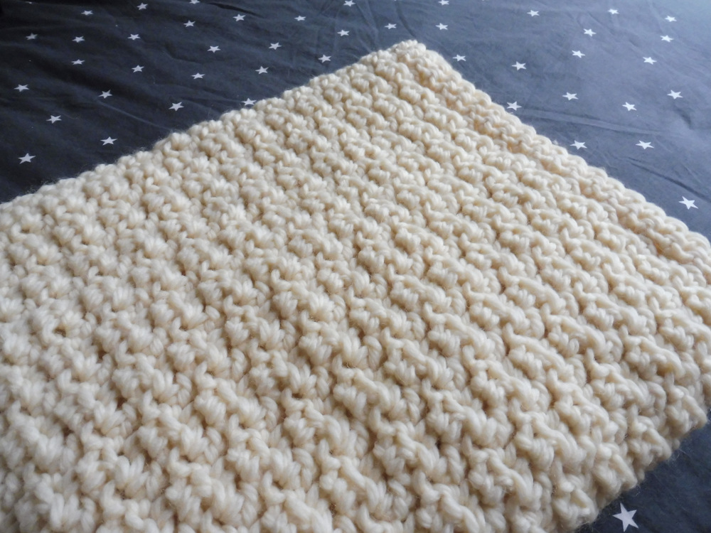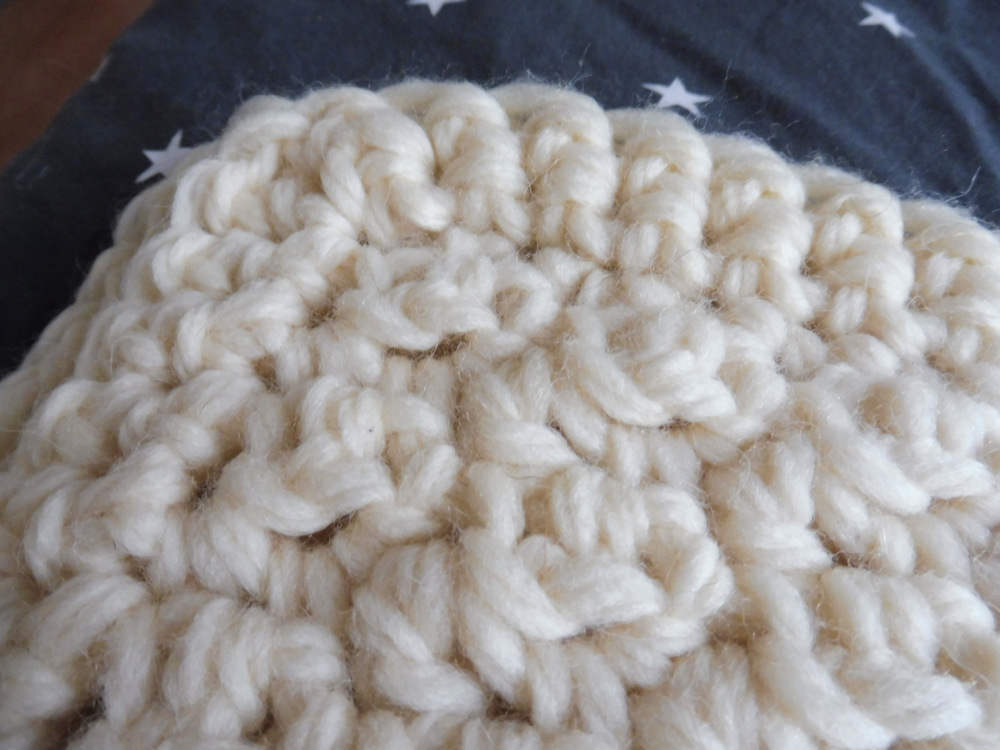 J’ai trouvé un modèle qui me plaisait ici, regardé sur le site de Rowan (la marque que j’arrive à me procurer le plus facilement) ce qu’ils avaient en fil super chunky et acheté trois pelotes de Big Wool dans la teinte 0001 White Hot chez Schleiper. 15,46€ pièce, gloups. Quand j’ai constaté qu’il m’en faudrait une bonne dizaine, j’ai commandé le reste à la boutique Art of Yarn sur eBay; c’était un samedi et j’ai reçu mon paquet très bien emballé le mercredi d’après, donc je suis très contente et je recommande ce vendeur.