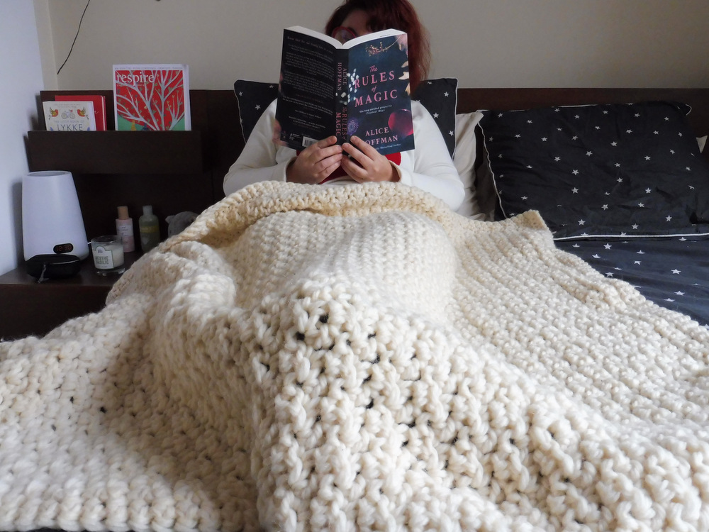 Pour le reste, c’était un vrai plaisir de retravailler de la laine. J’ai dû défaire et remonter les deux premières pelotes car j’étais partie sur une base trop large de 80 ch. La seconde fois, je me suis contentée de 71 (et à vrai dire, 65 auraient sans doute suffi). Constatant que je mélangeais les rangs A et B par distraction, j’ai décidé de travailler sur un nombre de mailles impair dès le début pour que tous mes rangs commencent par deux sc et se terminent par un sc, ce qui préserve le décalage nécessaire pour obtenir le joli motif. Enfin, comme je n’aime pas le côté brut des bords francs, j’ai terminé mon plaid avec une petite bordure de sc qui en fait tout le tour deux fois. Au total, c’est un carré d’environ 1,10m de côté.