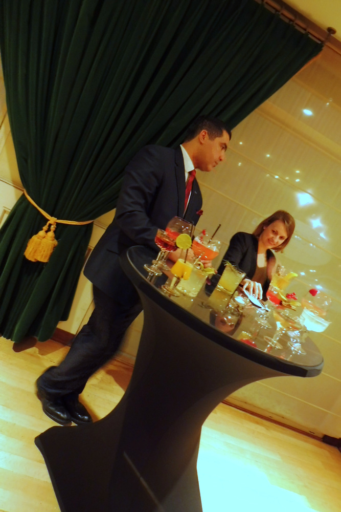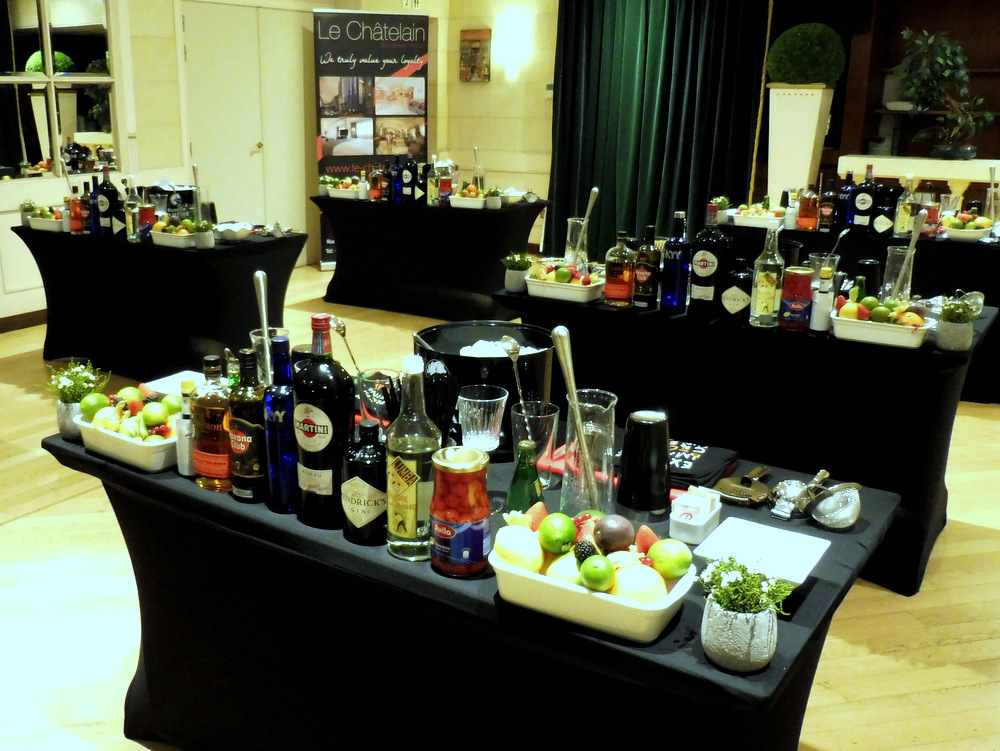 Hassan, le barman de l’hôtel, nous présente rapidement le programme du jour. D’abord, nous allons confectionner sur son exemple deux cocktails classiques, puis chacun de nous sera invité à préparer sa propre création qu’un jury composé de lui-même et de Marion, la chargée de communication de l’hôtel, goûtera pour choisir la meilleure de la soirée. En jeu: l’inscription de ce nouveau cocktail à la carte du Châtelain pour un mois, et la possibilité pour le ou la gagnante de venir le savourer gratuitement au bar pendant la même durée.