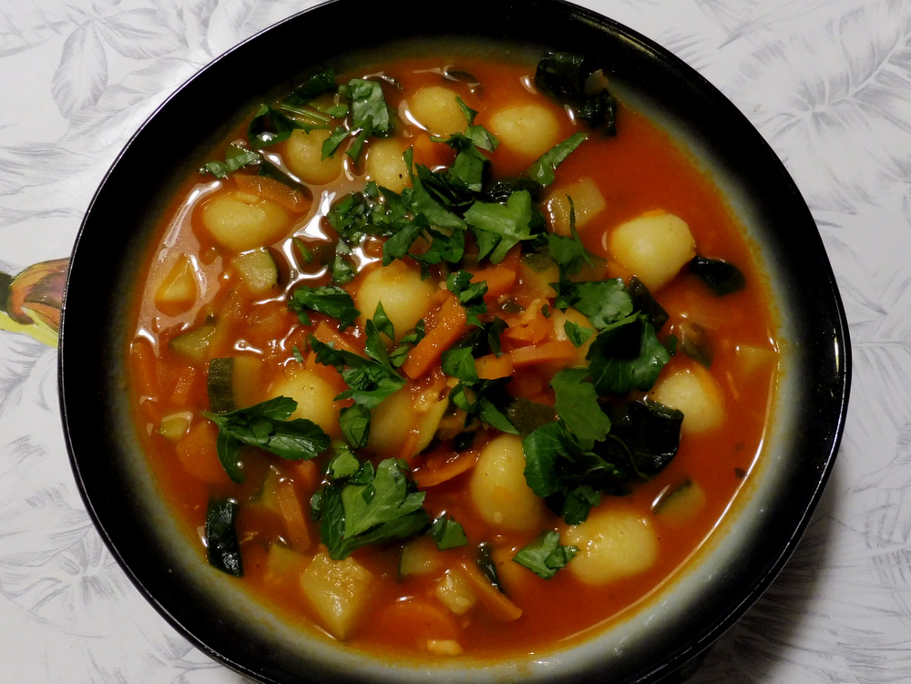 Quand les carottes sont tendres (j’avais fait des tout petits morceaux et ça a cuit en 20mn, mais avec de plus gros morceaux ça doit pouvoir aller jusqu’à 30 ou même 40 si vous utilisez un feu doux), ajouter les épinards dans le premier fait-tout. Deux minutes plus tard, ajouter l’eau de cuisson des gnocchi en remuant bien, puis les gnocchi eux-mêmes. Eteindre le feu. Servir immédiatement avec du persil haché et, si on veut, du parmesan.
