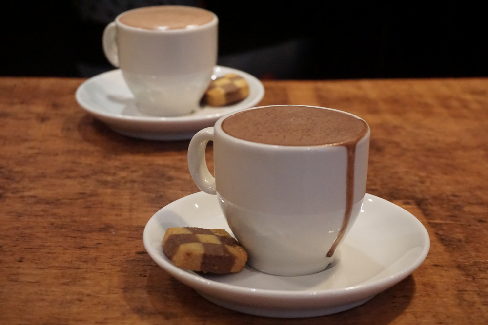 Après nous avoir expliqué quelles étaient les particularités des chocolats de tel et tel pays, et quel rôle jouait le pourcentage de beurre de cacao ajouté (plus il y en a, plus c’est doux et plus ça fond vite), le propriétaire s’est affairé devant son petit fourneau avec un fouet miniature. Quelques minutes plus tard, il nous a apporté deux petites tasses au contenu de teintes visiblement différentes, accompagnées d’un petit biscuit à damier. Chouchou ayant fait une coulure sur sa tasse en la déplaçant sur la table, il a aussitôt proposé de la remplacer, mais Chouchou s’est écrié: « Surtout pas, ce sera plus intéressant visuellement sur Instagram! ». Bien qu’un peu interloqué, le monsieur n’a pas protesté et s’est retiré derrière son comptoir en nous laissant savourer nos chocolats.