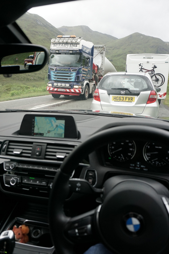 Vous trouvez que nous manquons d’ambition? C’est parce que clairement, vous n’êtes pas dans la voiture avec nous. Au début, tout se passe raisonnablement bien. Les conditions météo sont merdiques, mais Chouchou gère, et la beauté des paysages que nous traversons nous rassérène pas mal. Des cascades nourries par la pluie battante dévalent les pentes verdoyantes de part et d’autre de la route; ça ne rend pas grand-chose en photo mais ça se grave très joliment sur les rétines. A un moment, nous devons nous ranger sur le côté droit de la route pour laisser passer un convoi de cinq camions qui transportent chacun un morceau d’éolienne; c’est assez impressionnant.
