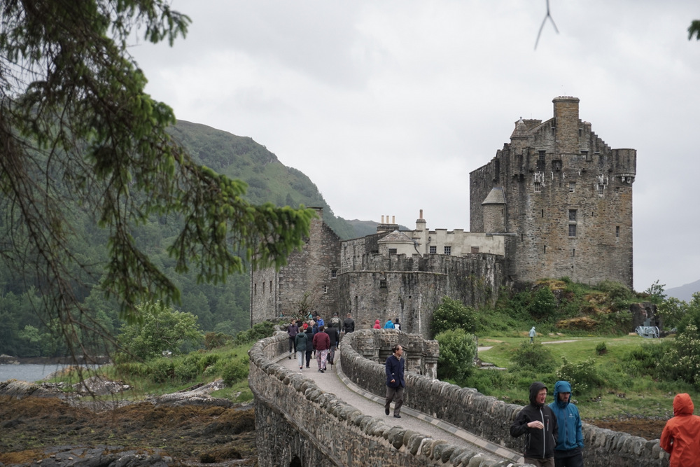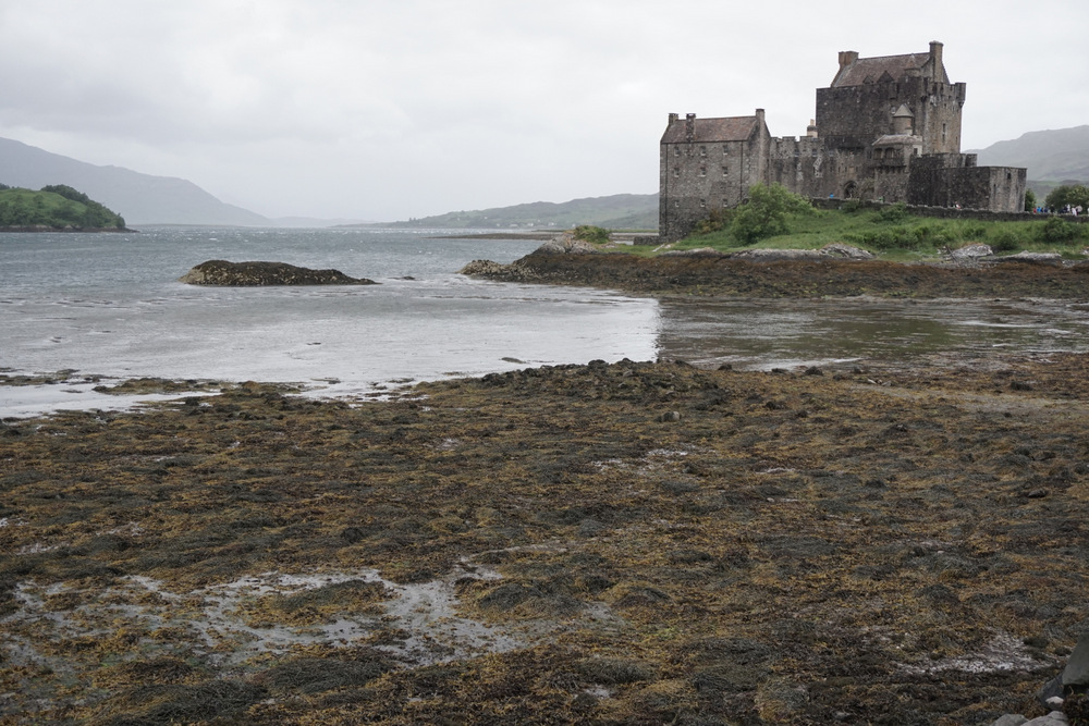 Les choses commencent à se gâter en fin de matinée. Chouchou a de plus en plus de mal à supporter sa lentille droite; il s’arrête une première fois pour la rincer et la remettre, puis une deuxième pour ôter ses deux lentilles et les remplacer par ses lunettes. Raison probable? Une capsule de lessive liquide qui a explosé dans sa trousse de toilette, contaminant ses lentilles. Il s’en était aperçu dès notre arrivée à Glasgow et avait nettoyé les dégâts, mais pas tout à fait assez bien visiblement. Les minutes passent; son oeil irrité est de plus en plus rouge, gonflé et larmoyant. Bientôt, nous devons nous arrêter tous les quarts d’heure pour qu’il puisse le nettoyer avec mes cotons démaquillants et mon eau micellaire. Notre trajet du jour devait durer 2h50, et au bout de ce laps de temps, nous n’avons même pas encore atteint le pont de l’île de Skye qui marque la moitié du trajet. L’important n’étant pas d’aller vite mais bien d’arriver entiers, nous faisons une pause non-prévue au château Eilean Donan pour reposer Chouchou et prendre quelques photos.