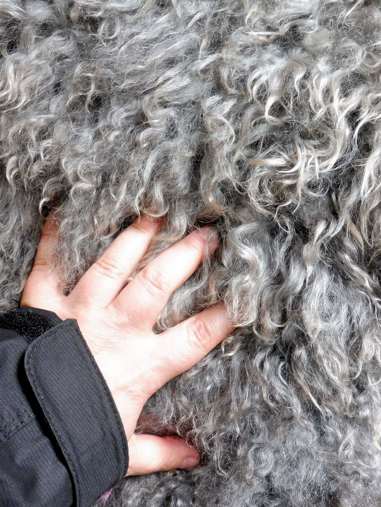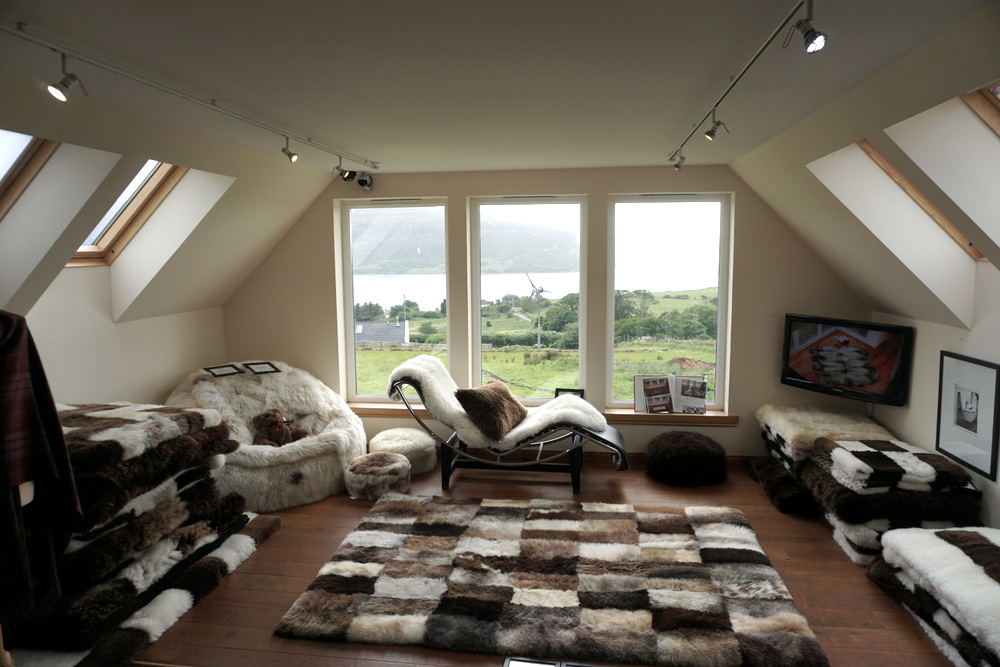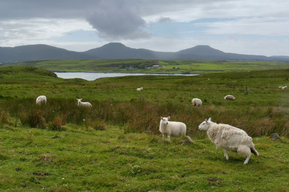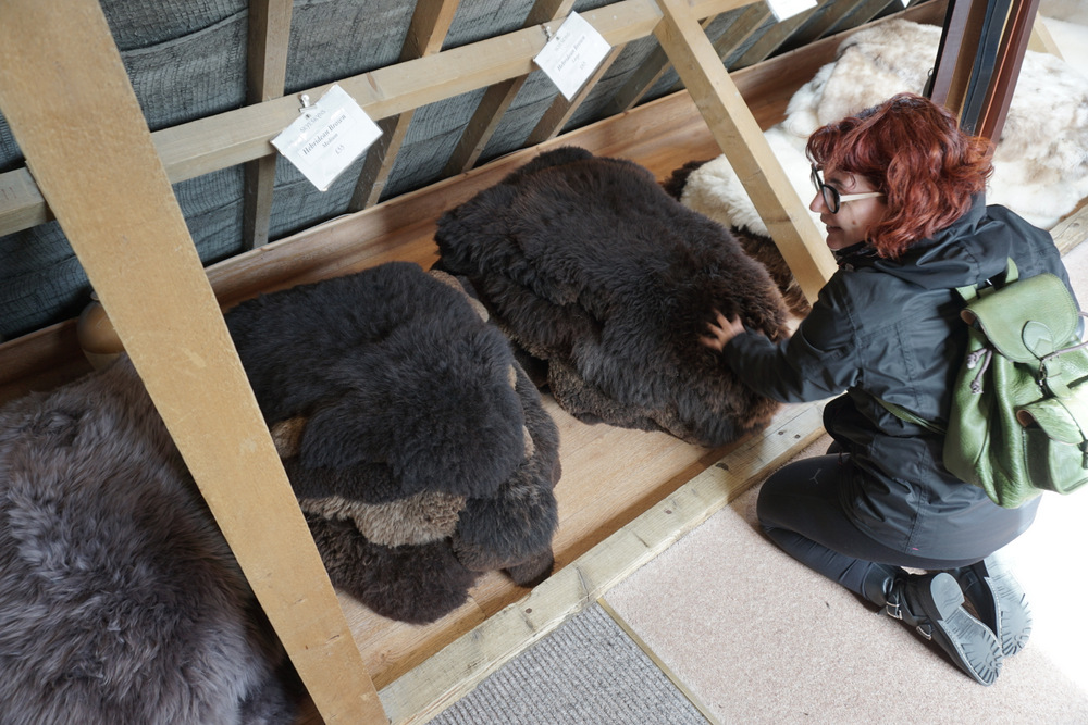 Chouchou n’étant plus en état de conduire et devant en priorité reposer son oeil, nous renonçons à pousser jusqu’au phare de Neist Point qui figurait à l’origine sur notre programme du jour. Par contre, nous nous apercevons que la tannerie Skyeskyns que je souhaitais visiter se trouve à… 300 mètres de notre logement. Nous partons donc à pied, en nous dépêchant car il reste à peine plus d’une demi-heure avant la fermeture. C’est trop tard pour la visite guidée, mais la boutique est encore ouverte. Après avoir hésité entre une peau d’agneau gris clair (qui ira mieux avec la déco actuelle de ma chambre) et une brun foncé (moins salissante et plus versatile à long terme, car j’ai bien l’intention de la garder très longtemps), je finis par opter pour une gris foncé, non sans avoir soupiré devant une gris clair frisée aussi douce que de la soie – mais importée de Scandinavie et coûtant £275, glups. A £49, la mienne reste un achat des plus raisonnables pour sa qualité. Je craquerais bien aussi pour un pull car il y en a de magnifiques, mais ce serait hors budget et je ne me vois pas le laver à la main après chaque utilisation.