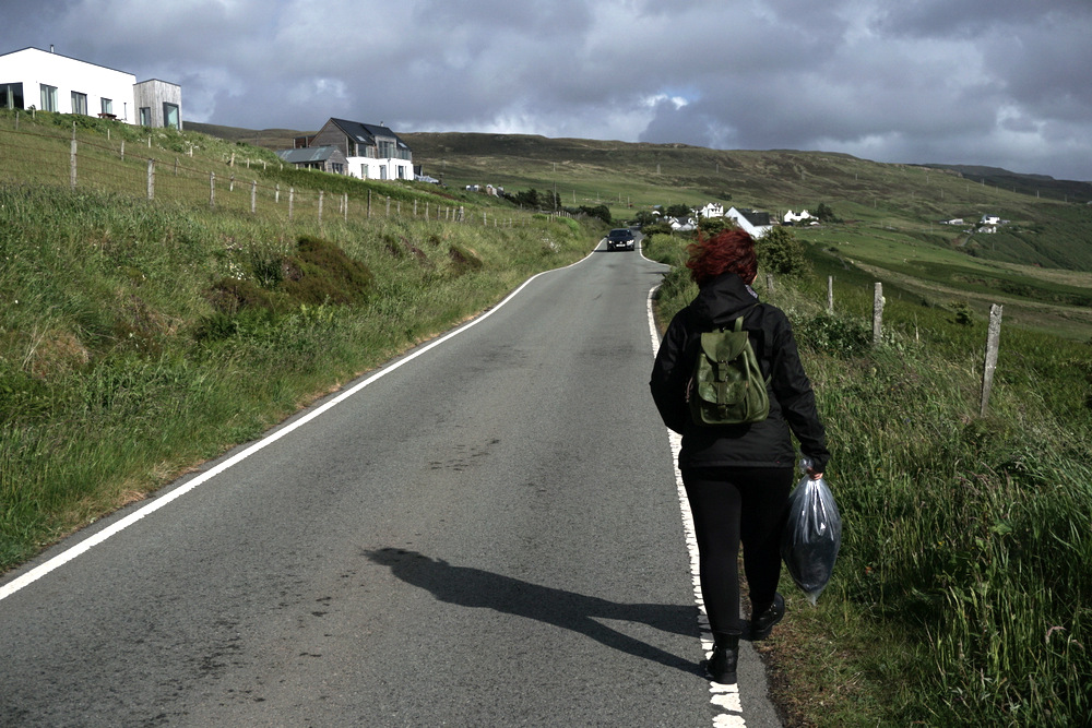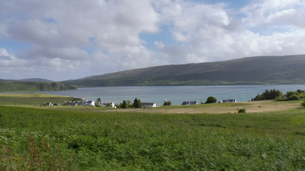 Afin de récupérer un peu du temps perdu, nous renonçons à faire une pause-déjeuner digne de ce nom et grignotons des trucs de chez M&S dans la voiture. Juste avant d’atteindre le Skye Bridge, nous traversons une agglomération pourvue d’une pharmacie. Chouchou s’achète un nettoyant oculaire et un paquet de Kleenex. Malgré ça, il souffre de plus en plus et y voit de moins en moins. Quand nous entamons enfin la traversée de l’île, il est si mal en point que même moi, je conduirais mieux que ça. Sauf que je n’ai pas emporté mon permis et que je ne suis pas assurée sur notre véhicule de location. Nous multiplions les arrêts et avançons à une allure d’escargot sur des routes où il est souvent impossible de doubler, si bien que les autochtones se retrouvent coincés derrière nous. Chouchou s’excuse de m’imposer ça; je m’excuse d’être un boulet infichu de le remplacer. On est tous les deux mortifiés mais on ne se tient pas responsables mutuellement, c’est déjà ça de gagné pour l’ambiance. Bref, la traversée de Skye qui devait prendre une heure nous en demande trois, très très éprouvantes de surcroît. Je joue les copilotes de mon mieux, en me maudissant d’avoir eu l’idée de ce road trip.