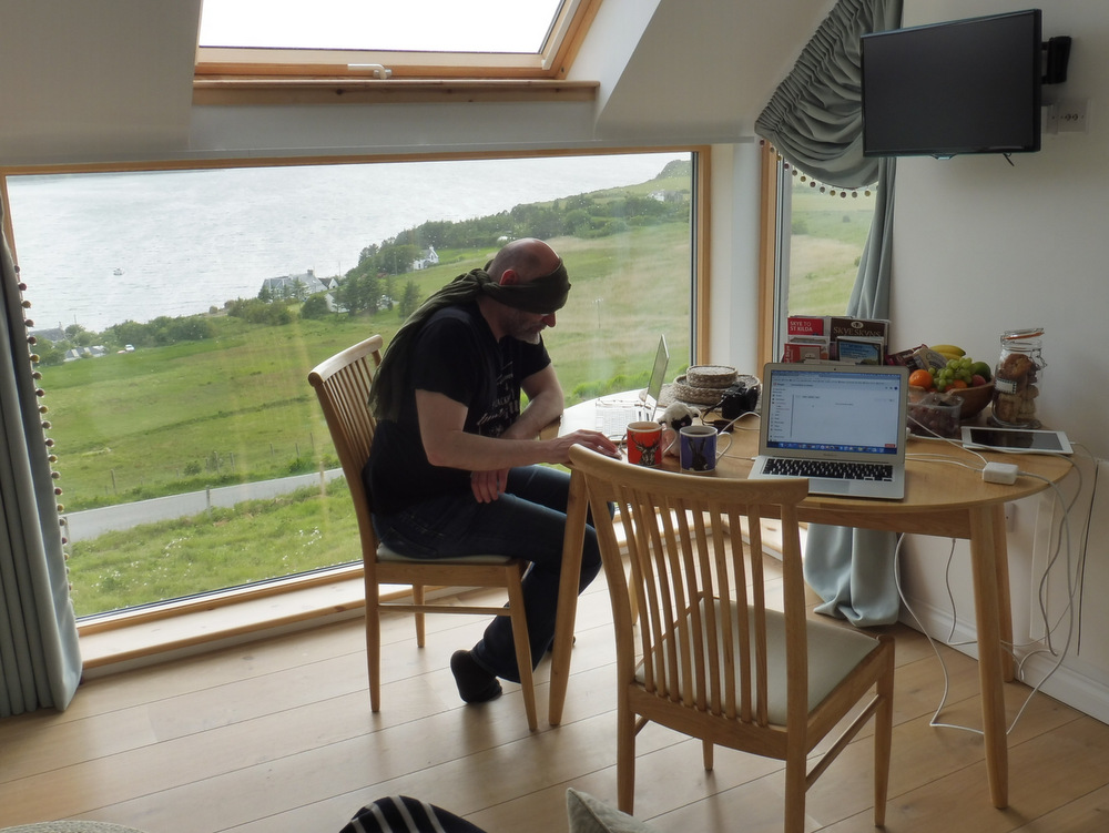 7h après notre départ de Fort William, nous arrivons lessivés (c’est le cas de le dire…) à notre Air B’n’B du jour. Et là, première satisfaction de la journée: l’endroit est sublime, une éco-maison conçue par un couple de dames anglaises un peu plus âgées que nous. Le studio que nous occuperons cette nuit est pourvue d’une grande baie vitrée sol-plafond qui donne sur le bord du loch s’étendant en contrebas. La vue est sublime, et nos hôtesses adorables, en plus de nous avoir fourni un frigo rempli à ras bord de charcuterie, de fromage, d’oeufs, de confiture et autres aliments froids, ainsi qu’une corbeille de fruits frais, nous demandent si nous voulons de quoi préparer un repas chaud – par exemple, des pâtes et du chou-fleur de leur jardin. Non, merci, un pique-nique nous conviendra très bien, mais on apprécie beaucoup l’intention (surtout en pensant à l’appart’ Air B’n’B de Lisbonne dont le propriétaire nous avait fourni deux rouleaux de PQ pour 8 jours et pas même un torchon pour essuyer la vaisselle).