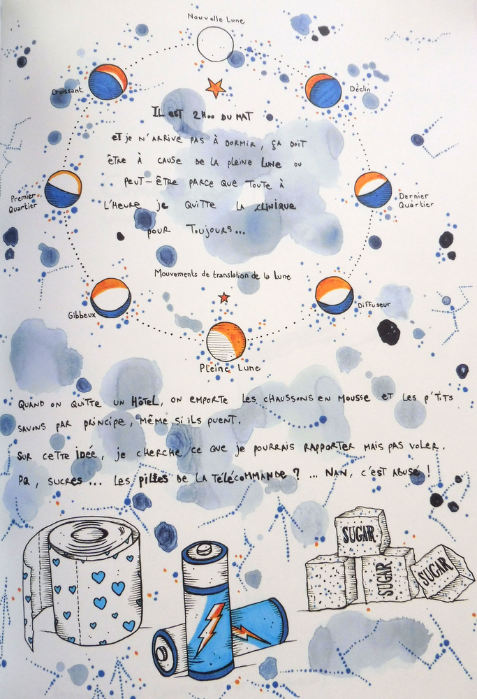 Sur chaque page, des taches d’aquarelle aux couleurs vives contrastent avec la gravité de sa maladie et les aspects déprimants du quotidien en clinique psychiatrique. Heureusement, KNL est bien entourée par une solide maman poule et un amoureux présent pour le pire comme pour le meilleur. Et puis surtout, c’est une fille combattive quand elle parvient à sortir la tête de l’eau, et qui peut se raccrocher à sa passion pour le dessin.