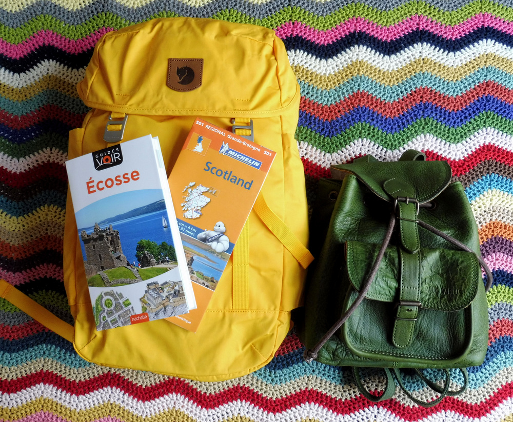 Je porterai sur moi une veste de randonnée légère avec une capuche pour me protéger de la pluie, et des boots solides et confortables pour marcher dans les Highlands. D’après la météo, il devrait faire entre 9° et 21° selon les jours et les endroits; donc j’ai visé une garde-robe automnale à laquelle je pourrai retirer des couches en cas de besoin. Et au retour, si nous souhaitons rapporter des souvenirs un peu encombrants, nous mettrons en soute la petite valise qu’utilise Chouchou pour avoir droit en cabine à un gros tote bag plein de shorbread et de laine d’Aran (au hasard).