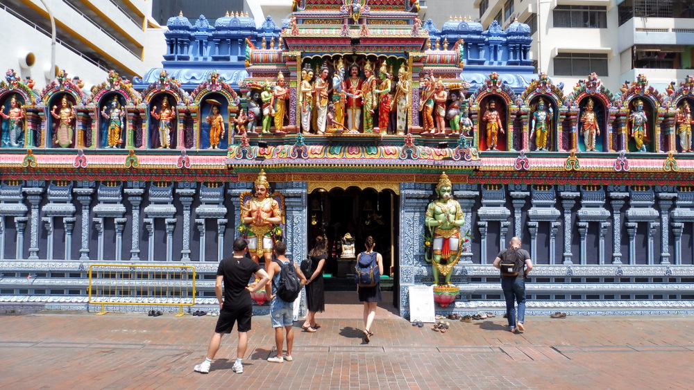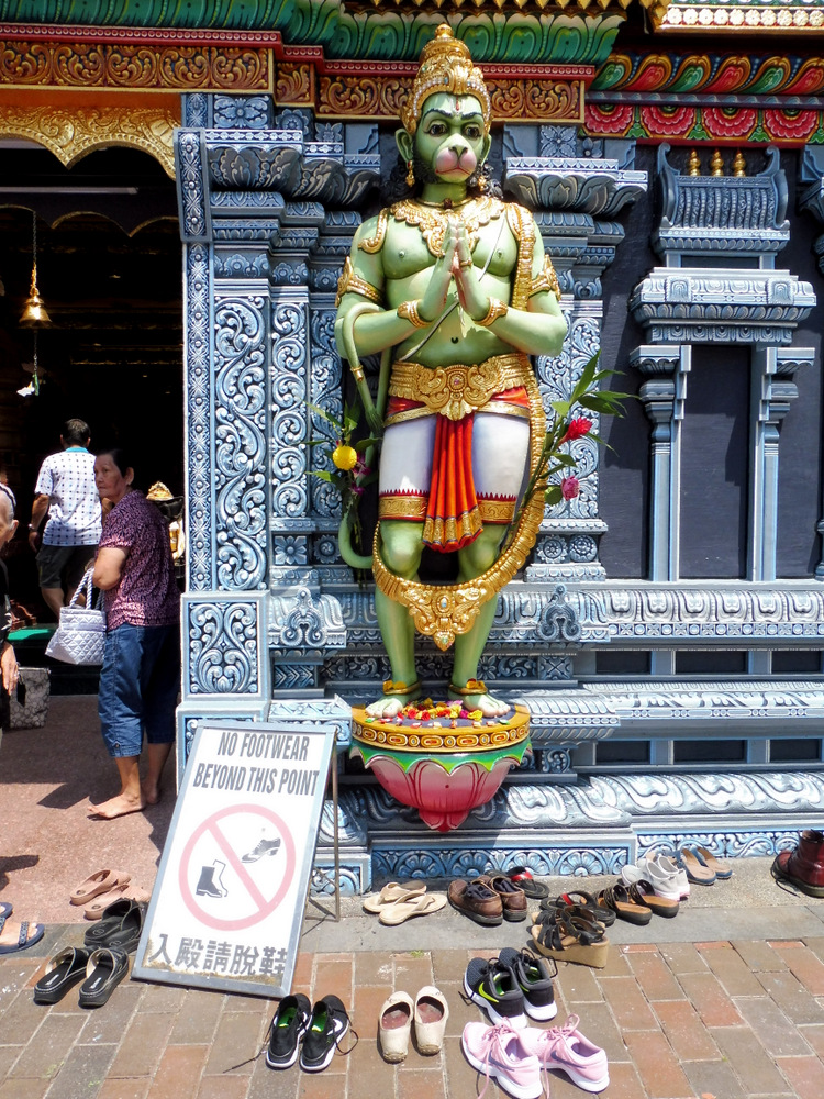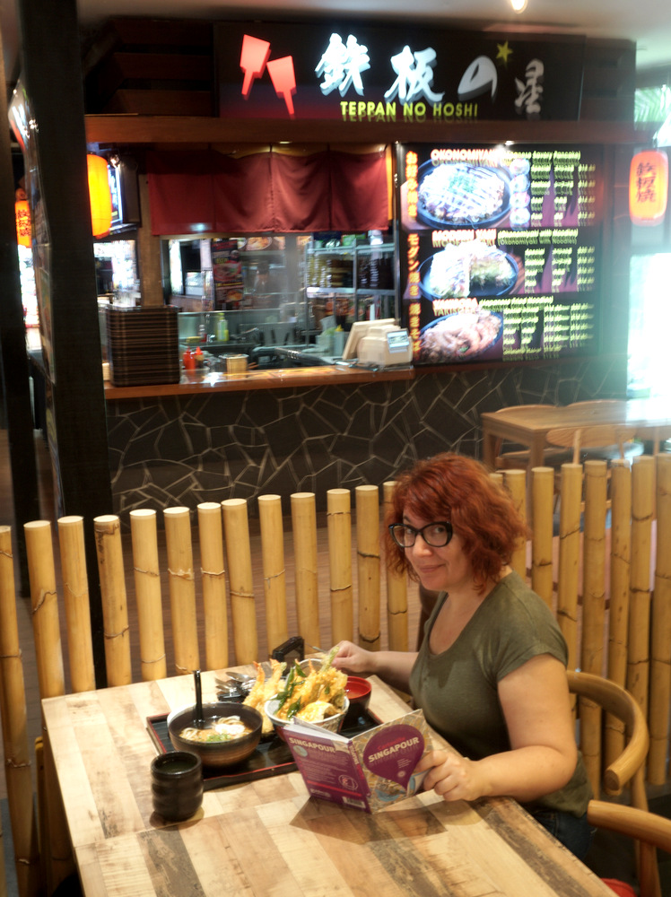 Nous visitons deux temples assez spectaculaires dans Waterloo Street: le Sri Krishnan, où nous devons nous déchausser pour entrer mais dont j’adore la débauche de bas-reliefs colorés, et le Kwan Im Thong Hood Cho où de nombreux fidèles déposent des offrandes de pivoines et d’encens dont l’odeur me met rapidement en fuite. Nous poursuivons notre chemin jusqu’au centre commercial Bugis+, dont l’étage supérieur abrite un food court japonais réputé pour sa qualité: le Ramen Champion. A l’entrée, un alpagueur avec une voix assez étrange nous donne des bracelets à présenter sur chaque stand où nous achèterons quelque chose, puis à la caisse de sortie où nous règlerons tout en une fois. Le food court est ouvert depuis peu et nous y mangeons (très bien) à peu près seuls: menu udon + tempura pour Chouchou, tendon à l’oeuf salé pour moi.