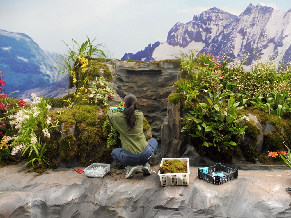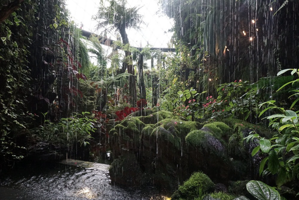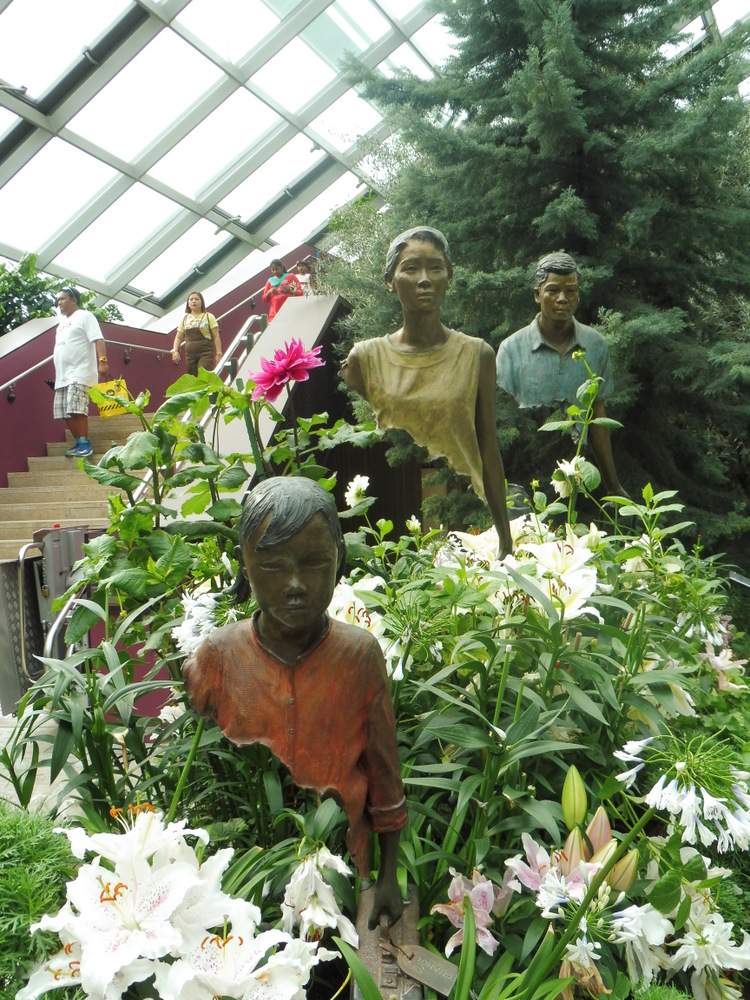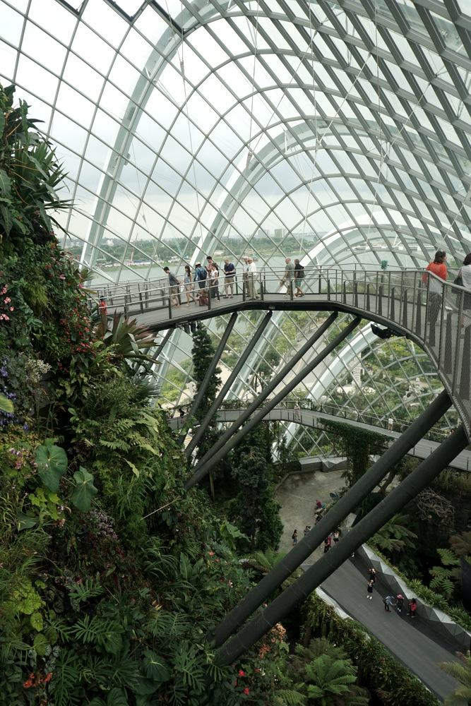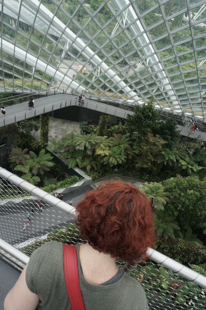 Dès que je pénètre dans la Cloud Forest, toute la fatigue, l’irritation et le ressentiment des derniers jours s’envolent comme par magie. Cette serre agréablement fraîche et humide reconstitue un milieu naturel rare et menacé, un type de forêt tropicale qu’on ne trouve qu’en haut de certaines montagnes quasi perpétuellement enveloppées de brume. Je n’ai pas de mots pour décrire à quel point l’endroit est enchanteur avec son immense cascade, ses sculptures cachées parmi les orchidées, sa passerelle vertigineuse et son climat bienfaisant. Je passe tout la visite à répéter en boucle: « Mais que c’est beauuuuuuuu » en ouvrant de grands yeux émerveillés. Alors que même les succulentes ne tiennent pas plus de quelques mois sous ma garde, je me retiens de solliciter un entretien d’embauche auprès des jardiniers affairés à transformer une plate-bande. Ces gens font le plus beau métier du monde dans le plus bel endroit du monde. Et puis juste avant la sortie, une exposition parle des dégâts provoqués par la pollution et le réchauffement climatique. Pas de pathos, juste du factuel. Le film projeté sur grand écran qui montre l’évolution projetée de la planète jusqu’en 2100 me fait pleurer à chaudes larmes. Toute cette beauté qu’on est en train de tuer, ça me flingue. Si on ne fait rien (et je pense qu’on ne fera pas grand-chose, parce que les gens qui en ont le pouvoir ne sont pas motivés pour ça), d’ici la fin du siècle, la Terre sera devenue un caillou invivable.