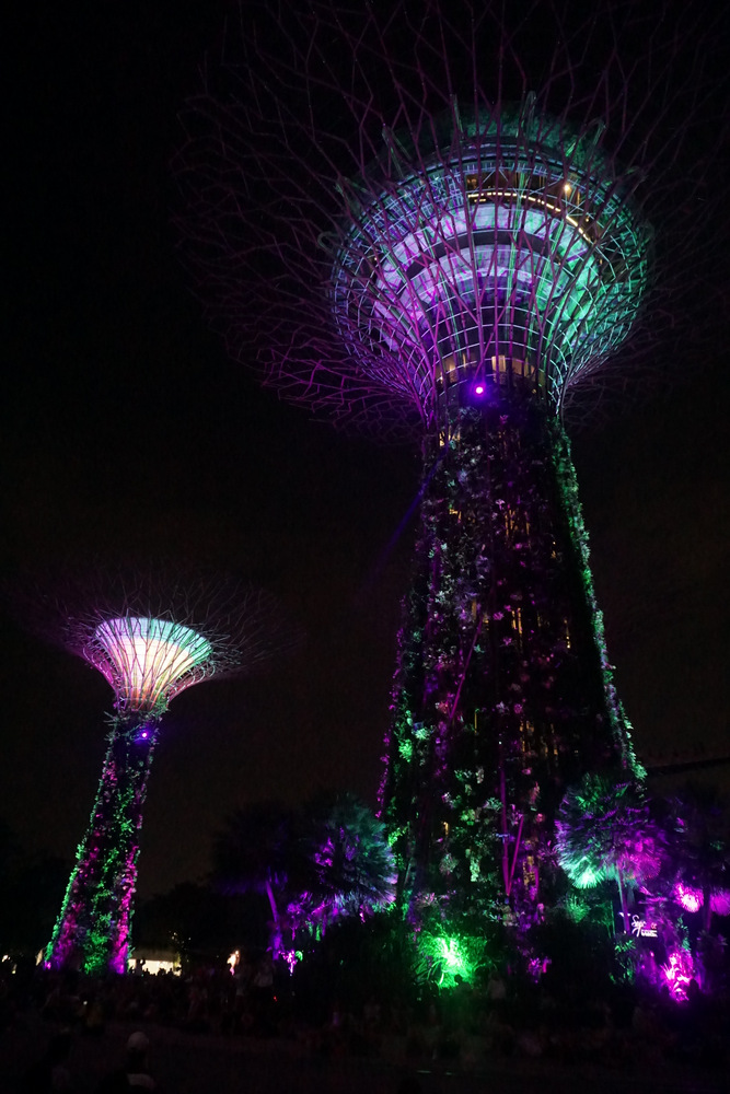 Vers 19h45, une brève annonce nous informe que nous allons assister à un spectacle son et lumières sur le thème de la lune. Et pour la deuxième fois de la journée, les mots me font défaut alors qu’allongée entre deux jeunes Asiatiques qui filment avec des perches à selfie, j’ouvre grand les yeux pour ne pas perdre une seule miette de cette féérie. Six ou sept chansons – dont « Blue moon » et « Fly me to the moon » – se succèdent tandis que des lumières roses, violettes, bleues ou vertes courent le long des troncs et éclatent au bout des branches. Il me semble que tous les spectateurs retiennent leur souffle, que ces centaines d’inconnus et moi sommes momentanément unis dans une communion d’émerveillement. Quand ça se termine, bien trop vite à mon goût, nous nous dirigeons tous en un flot calme et murmurant vers la station de métro la plus proche. C’est cela que j’étais venue chercher à Singapour, et c’était encore mieux que je ne l’imaginais.