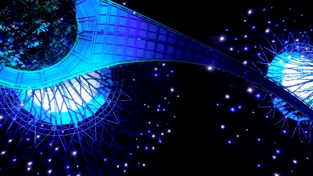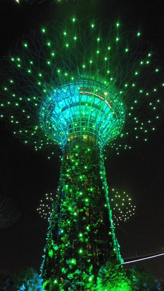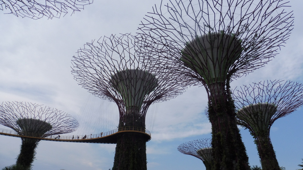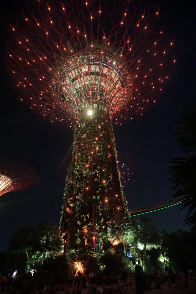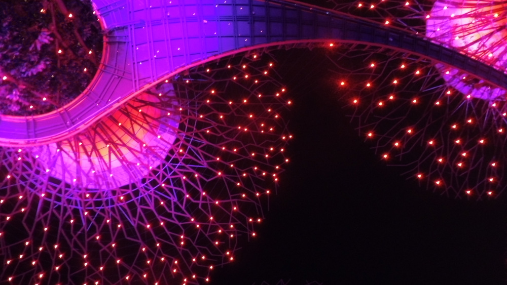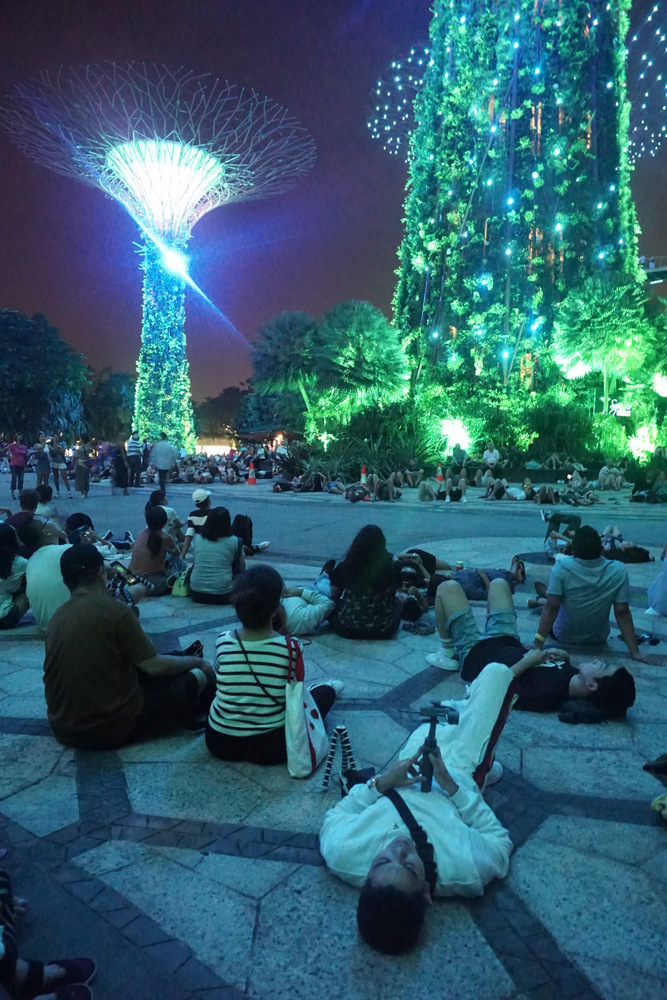 Nous sortons et nous dirigeons vers le Supertree Grove, le bosquet de super-arbres mi-végétaux mi-métalliques qu’on voit sur toutes les photos iconiques de Singapour depuis 2012 et la raison numéro un pour laquelle j’ai tenu à venir dans cette ville. Nous montons sur la passerelle qui relie les arbres entre eux, puis décidons d’aller boire un verre au bar IndoChine située au sommet du plus gros. Avant d’accéder à l’ascenseur, on paye un droit d’entrée qui donne droit à une boisson. Comme Chouchou ne boit pas d’alcool, il a droit au tarif enfant, et à un bracelet rouge plutôt que jaune, ce qui nous fait bien rire. De là-haut, on voit la baie de Singapour encombrée par des dizaines de cargos, ainsi que les immeubles triplés surmontés par une sorte de « bateau » dont j’ai oublié le nom. C’est bien le seul intérêt du lieu: en guise de cocktail, on m’apporte un mélange de vodka bon marché et de jus de fruit dégueu dans un verre en plastique. Même Chouchou, peu difficile en la matière, grimace en prenant une gorgée de son jus d’ananas et déclare que c’est le plus mauvais qu’il a jamais bu. Nous voulions traîner là jusqu’à la tombée de la nuit et à l’illumination des supertrees, mais au bout d’un moment, je suis prise d’une migraine aussi subite que violente, et je demande à redescendre pour pouvoir m’allonger sur un des larges bancs qui entourent le pied des arbres. J’y passe l’heure suivante prostrée avec l’impression que ma tête éclate en mille morceaux. Autour de moi, je sens que les gens affluent petit à petit; quand les bancs sont tous occupés, ils s’assoient carrément au milieu des allées, le nez en l’air comme en attente d’une apparition divine tandis que de petites lumières commencent à clignoter parmi les branches des supertrees.