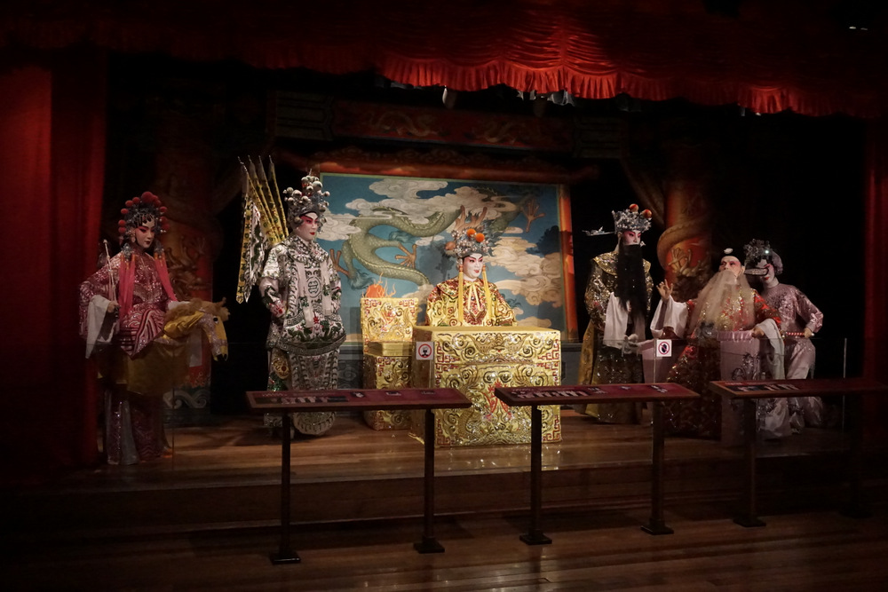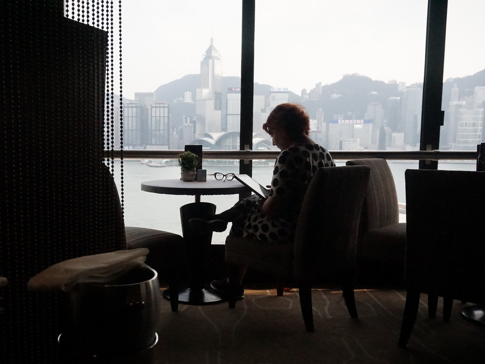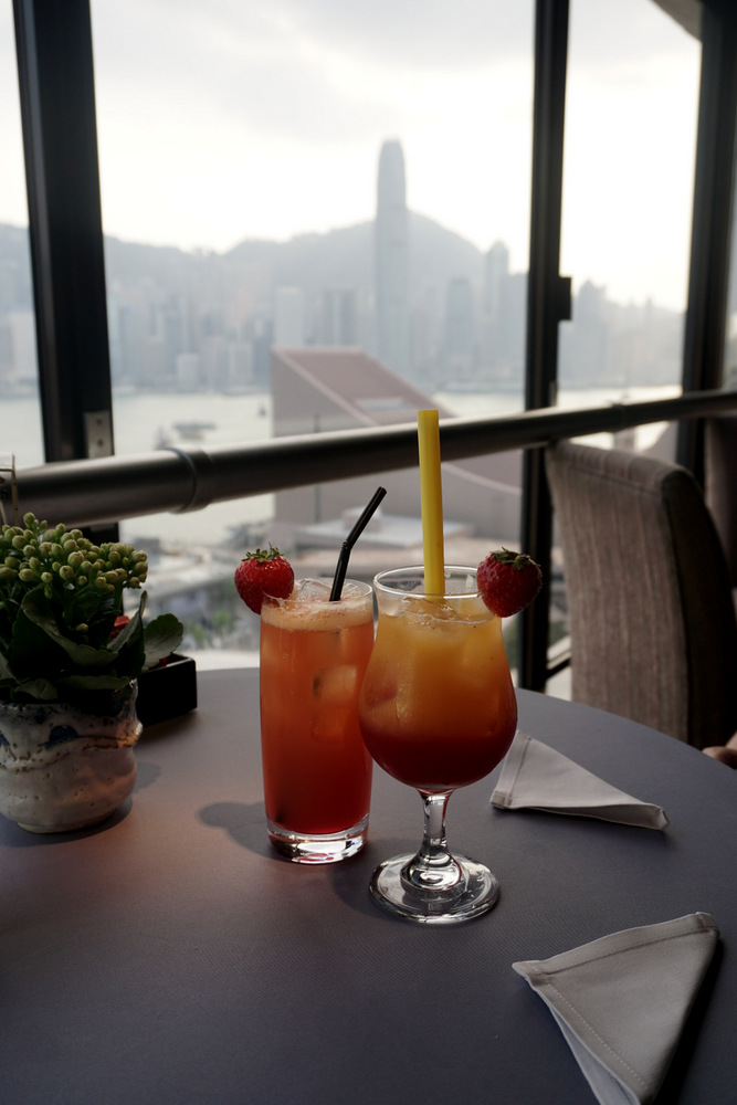 La première vraie visite de la journée est donc pour le Hong Kong Heritage Museum, ou musée du patrimoine. Malheureusement pour moi, la seule des expos temporaires qui m’intéressait s’est achevée la semaine dernière. Reste un truc gigantesque et très bien foutu sur les peintures rupestres des grottes de Mogao (Chouchou adore; je reste de marbre); une présentation de l’opéra cantonais (moui bon bof) et une rétrospective de la vie de Bruce Lee, richement documentée et joliment scénographiée, qui met Chouchou en joie mais m’indiffère au-delà de ce que les mots peuvent exprimer. A la sortie, je suis plutôt grognon et décide que le meilleur moyen de me remonter le moral serait un des célèbres afternoon teas du Sheraton. La redescente en métro est quasiment directe et beaucoup plus rapide que l’aller. L’afternoon tea du Sheraton, en revanche, se révèle minuscule, chichiteux, signé Lalique et pas du tout dans mes goûts. Mais comme la vue est magnifique depuis la table qu’on nous a attribuée, je me dis que non, 16h, c’est pas trop tôt pour boire un cocktail, et faute de créations maison séduisantes, je commande un bête Sex on the beach (ici au moins, je sais que le serveur ne va pas ricaner bêtement) tandis que Chouchou jette son dévolu sur un mocktail appelé Red Berry Sling.