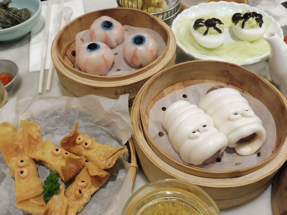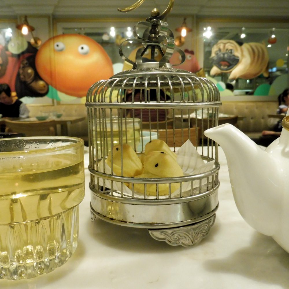 Pour me remettre de mes émotions, un peu de shopping thérapie serait la bienvenue. Nous repassons au magasin Donburi Republic de l’autre jour, où je fais l’acquisition d’un ensemble tasse à thé/soucoupe et d’un gobelet Totoro – mon premier achat un peu encombrant. Nous nous mettons ensuite en quête du Yum Cha local tout en guettant une éventuelle droguerie où nous pourrions acheter de la lessive à la main pour laver quelques bricoles dans le lavabo de notre chambre d’hôtel. Nous ne trouvons pas de droguerie, mais dans un des multiples magasins de cosmétiques locaux, je tombe sur 2 autres masques visage à l’effigie de Lady Oscar. Et après avoir tourné un moment en vain, nous finissons par localiser le resto. La salle est beaucoup moins grande, agréable et jolie que celle de l’établissement de Central, mais nous sommes désormais en octobre, et il y a plein de dim sum d’Halloween rigolos à la carte – ce qui simplifie grandement mon choix. Je merdouille la commande de boissons, sors le sachet de thé au jasmin de l’eau pour stopper l’infusion et reçois un regard désapprobateur de la serveuse quand elle vient récupérer la théière vide pour y remettre de l’eau chaude, et réussis en prenant une photo de notre table couverte de mets à faire tomber la cage contenant les sablés à l’ananas en forme d’oiseaux. Mais l’important, c’est de ne pas se démonter même couverte de miettes.