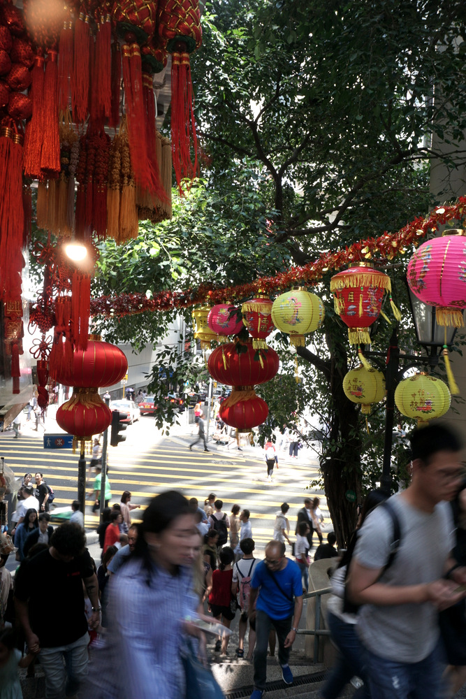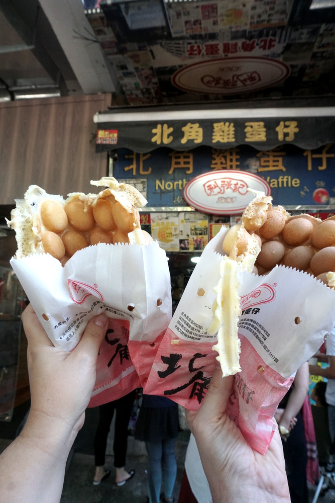 Pour notre toute dernière journée, j’ai décidé qu’on allait se la jouer cool: acheter des bubble waffles au « meilleur stand de Hong Kong », qui se trouve juste à côté de notre hôtel, puis retourner à Central, qu’on a parcouru en vitesse le premier jour seulement, histoire de faire encore quelques photos, tester un resto et acheter deux bricoles. Et quand on on en aura marre, on repassera à l’hôtel chercher nos bagages, puis prendre le bus A21 pour gagner l’aéroport. Un plan « no plan » qui ne peut pas échouer, non? Hé bien, si! Les bubble waffles sont vendues nature – pas mauvaises mais elles auraient été nettement meilleures avec un peu de glace, de crème, de sauce sucrée ou à peu près n’importe quoi d’autre; aucune des enseignes qui nous intéresse n’a de boutique dans Central, et les trois étages de la très belle Luk Yu Tea House où j’aurais aimé déjeuner affichent complet. Nous reprenons le métro dans l’autre sens.