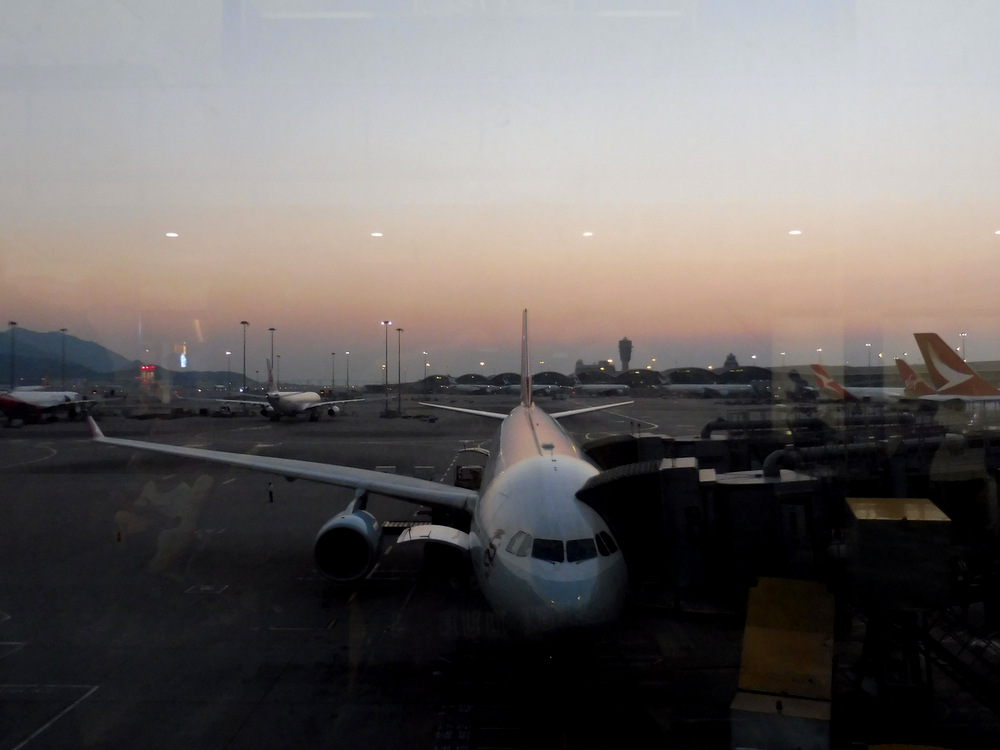 Il doit être à peine 16h30 quand nous passons récupérer nos bagages à l’hôtel. Une heure plus tard, nous sommes à l’aéroport. Nous regardons notre petite valise s’éloigner sur le tapis roulant du comptoir Cathay Pacific en espérant ne pas oublier de la récupérer à l’arrivée, tant nous n’avons plus l’habitude de voyager avec des bagages en soute. Je dépense mes derniers dollars hongkongais en bricoles pandaesques pour Darklulu et vide ma carte Octopus avec l’achat de club sandwichs sans goût. Puis nous cherchons un coin pour nous poser au calme et tuer en surfant sur le wifi gratuit les 6 heures qui nous séparent du décollage de notre vol de retour. Quand notre porte d’embarquement est annoncée, bien entendu elle se trouve de l’autre côté de l’aéroport, mais ça nous permet de jeter un coup d’oeil aux boutiques dont certaines sont vraiment sympas.