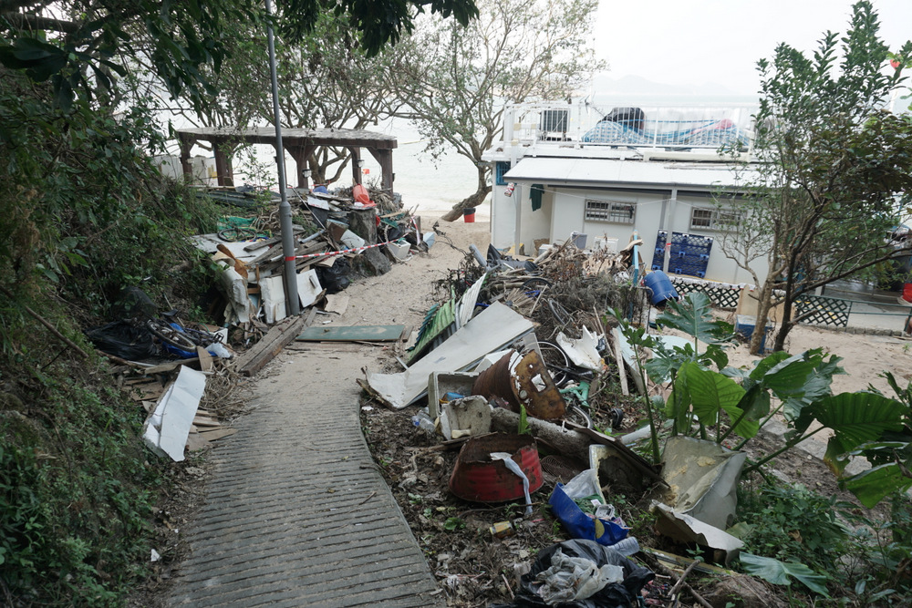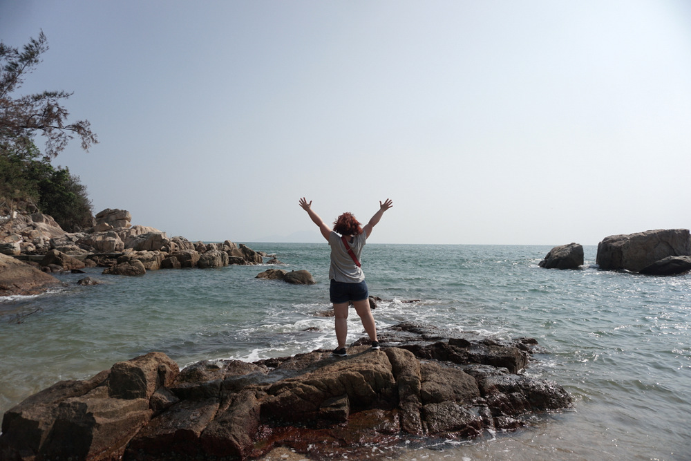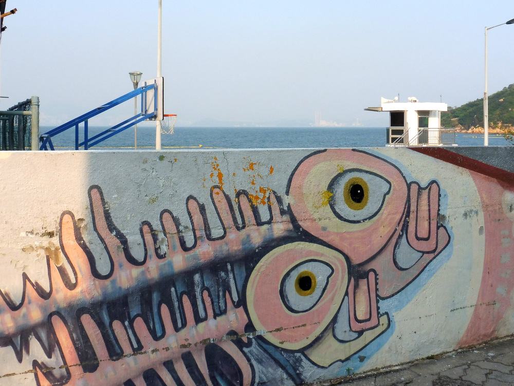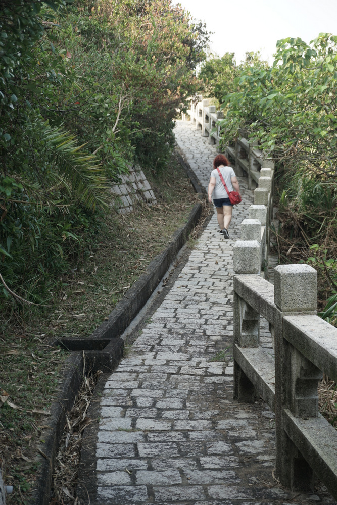 Plus loin, nous suivons le tracé de la Petite Grande Muraille. Les dégâts faits par le typhon Mangkhut il y a deux semaines sont encore flagrants, que ce soit dans la végétation arrachée, les distributeurs de boissons renversés ou, lorsque nous redescendons enfin vers la plage locale, l’héliport à moitié détruit. Nous nous arrêtons au bar du club de windsurf pour boire enfin un truc frais. La vue est superbe; dommage qu’une énorme bestiole de la famille des guêpes (mais qui n’en est pas une; je ne pense pas qu’on ait cette espèce en Europe) tourne autour de tous les verres en me terrorisant à demi. Nous achevons enfin la boucle et regagnons le port deux minutes avant l’appareillage du prochain ferry.